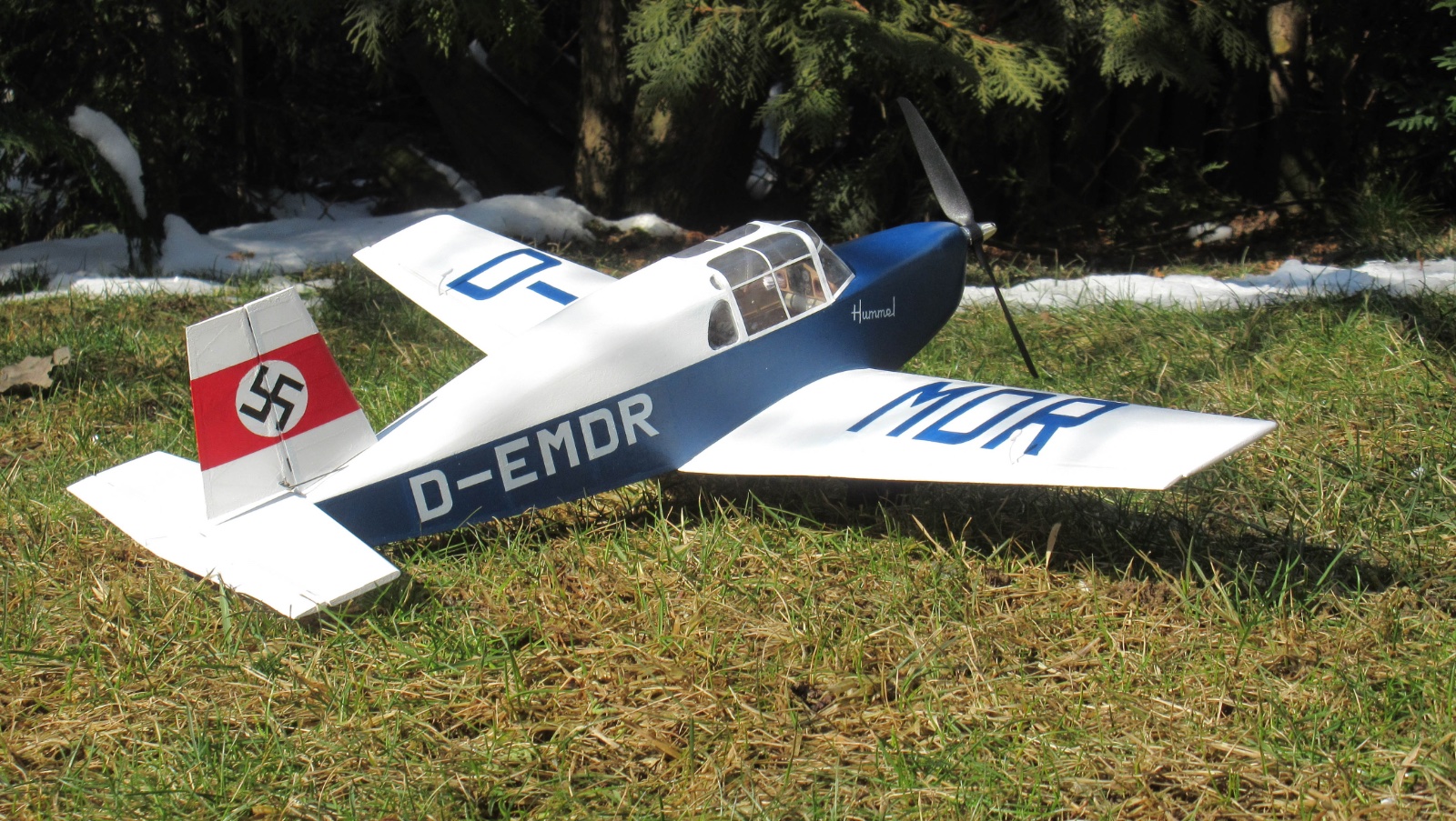 Dokončeno - Fluggewicht 160g. Ovládání křidélek hliníkovou trubičkou skrz konstrukci křídla (inspired by Felda), náhon k výškovce a směrovce ocelový drátem zakončeným v papírové trubičce v uhlíkové páce. Písmena na křídlech jsou stříknutá skrz šablonu (papír Tamiya - https://www.peckamodel.cz/produk...