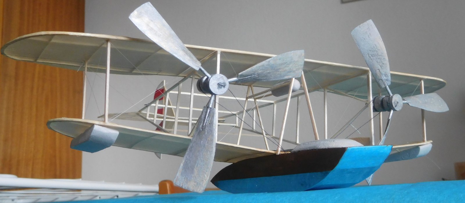 tak jsem se nechal vyhecovat a ten MARINESAPARAT No2 jsem jako oříška postavil i když oficiální dokumentace postrádá půdorys. Moje rekonstrukce měla jednu slabinu, tou je přesný tvar VOP, ten jsem převzal z původního tvaru Curtisse. Vlastní stavba odpovídá výkresu, který jsem ti již poslal. Můj odhad váhy byl dost přesný, nyní bez gumy je to 9g, takže letová by neměla být více jak 11g. Samozřejmě, že jsem model zkoušel klouzat do měkké postele, bez vrtulí klouzal hezky, s velkými třílistými vrtulemi je to podstatně horší. jsem zvědavý jak se celá konstrukce bude chovat až na ní zavěsím natočené svazky, doufám, že to nějak zvládne, alespoň na menší moment, ale to ukáže až praxe.