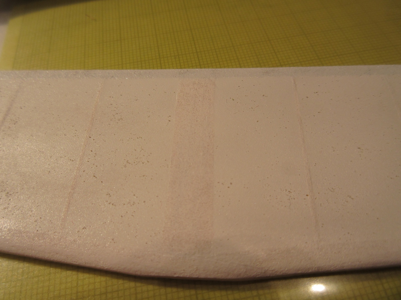 Děje se to pouze nad kostrou, volný plochy potažený jen papírem jsou bez problému. Barva akryl Tamyia XF-2, naředěná jen o cca 10% originálním ředidlem (původně jsem naředil o 200% dle nějakých doporučení, co jsem našel, ale bylo to moc, nakonec jsem skončil až u těch pouhých 10%)