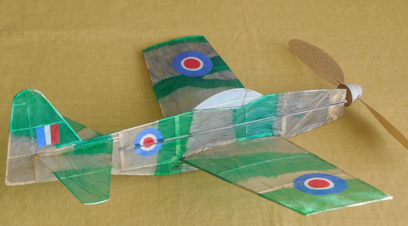 Velmi dobré zkušenosti s maličkou polomaketou Martin Baker MB-5 kategorie living room clas z období covidu 19 mne přměla zkusit tento typ jako NO CALL- MYslel jsem si, že ušetřím čas použitím vrtule s ložiskem z neúspěšného předešlého typu. MB-5 má téměř stejnou obrovskou plochu křídla, ale také dost velká kormidla, takže byl zájem použít na potah to neljlehčí, co je k dispozici - kondenzátorový papír, nepravidelné pruhy šedé a zelené barvy jsem maloval anilinkami, po uschnutí byl papír dosti krabatý, snaha o vyrovnání žehličkou, byla úspěšná tak na půl. Doufal jsem, že hotový potah vypnu po navlhžení vodou, omyl na barvený a žehlený kondenzátorák již voda dále nevyoíná, Váha po obarvení vzrostla na 11 g/m2, což je pořád o 1/3 méně než moje nejlehčí papíry, Hotový model vážil bez gumy 6,2g. Na svazek z gumy 2,5g/m se choval naprosto stejně jako předešlý typ, občas stabilní let z ničeho nic přešel do pádu, ale po dotyku vrtulé se zemí provedl srovnání a při zemi hezky letěl. Bylo mi jasné, že model je těžký na zadek a má malý úhel seřízení, Dovážení modelářským špendlíkem do náboje vrtule, zvětšení úhlu seřízení a nový svazek z gumy 3,4 g/m model oživilo, ale začaly problémy s pevnosí trupu, který se silně prohýbal již při polovině z max otáček. Zpevnění motorsticku uhlíkem pomohlo, bylo však zapotřebí další dovážení. Nyní je jasné, že zadní závěs měl být o pole v předu a odpadlo by ono dovažování. Problémem zůstává měkké ložisko a potřeba často dolaďovat úhel osy vrtule. Nyní je již váha prázdného modelu 7.4g a protože chci létat na svazek z gumy 2,5 g/m, tak jsem musel zmenšit průměr vrtule z 240 na 215mm. Rozhodně to nebude rekordní model. Pokud se letové vlastnosti výrazně nezlepší, pak bude následova přesun zadního závěsu o jedno pole dopředu, odbourání dovážení na prázdnou váhu 6,4g, pokud ani toto nepomůže tak to poslední,co mohu udělat je nové tuhé ložisko. Nepomůže li ani toto, tak jinak hezký model skončí v popelnici.