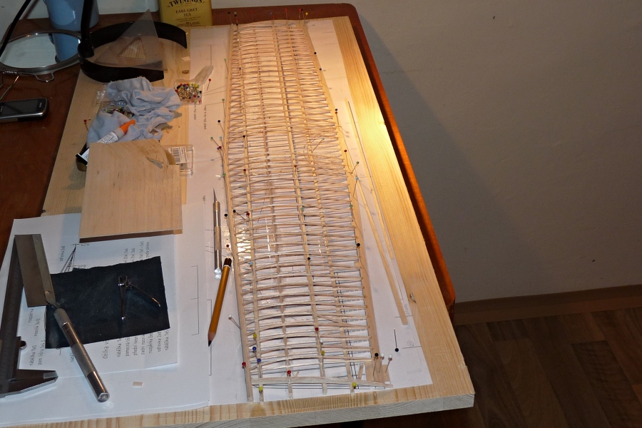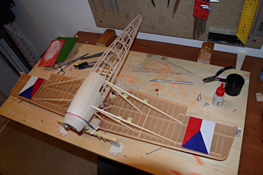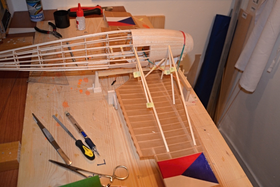 Díky, pánové, za povzbudivá vyjádření. Skutečně je toto můj druhý výlet do světa minimaket, předtím jsem prošel od házedel, gumáků a sifoňáků k RC elektroletům. Letov Š-3 beru mimo jiné jako ověřovací kousek pro techniky, které jsou pro mě nové - stříkání, tisk obtisků atd. Dost jsem se například zasekal na přípravku pro usazení křídla nad trup, ve kterém jsem doměřoval a následně lepil vzpěry. Udělal jsem bezva přípravek, přesný a bytelný... ale s drobnou vadou na kráse - po zalepení vzpěr bych ho nevypreparoval ven. Naštěstí jsem to odhalil před finálním zalepením vzpěr, po úpravách řezu - lepím nakonec všechno klaplo.