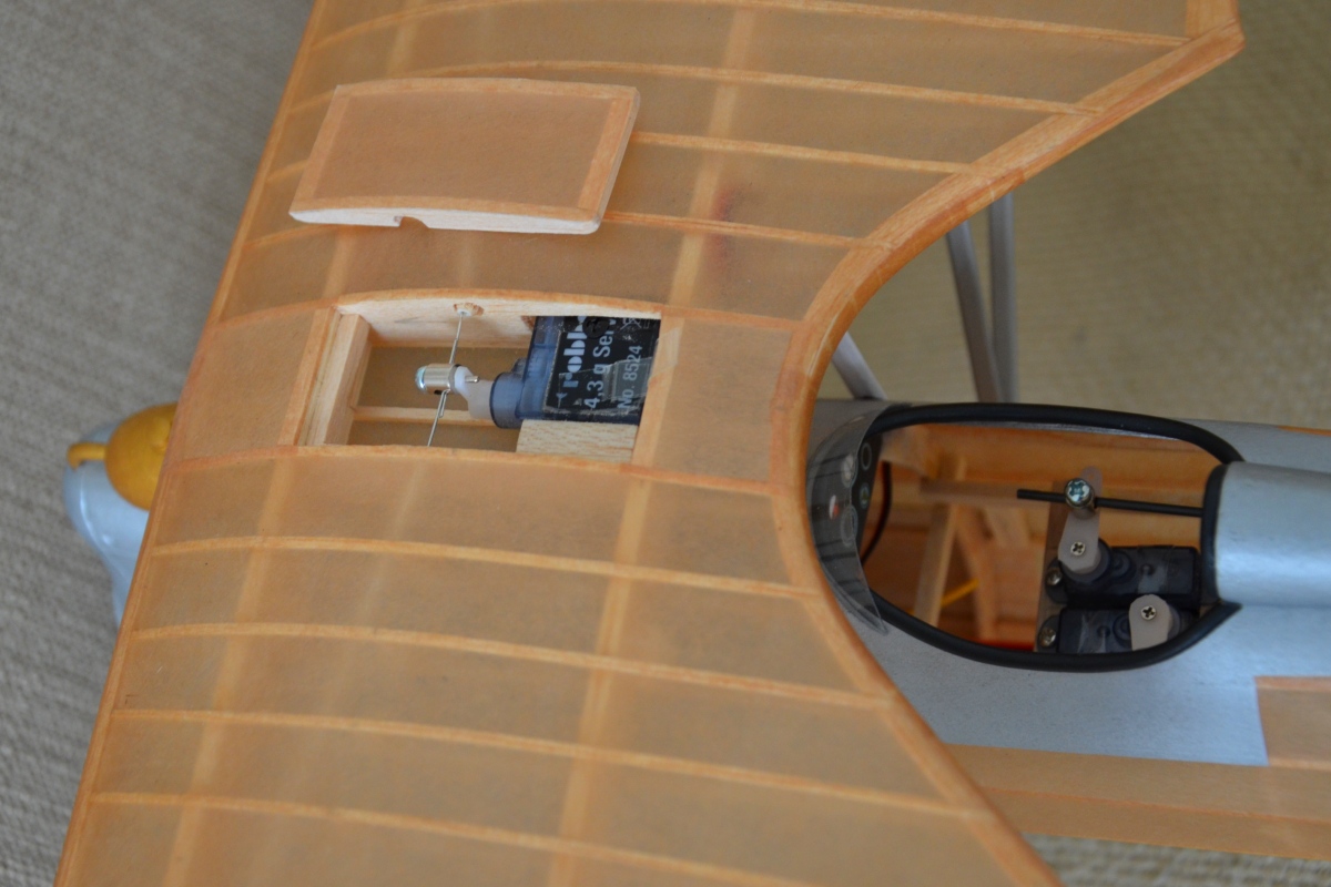 Ano, souhlasím, že bowdeny obecně zlobit můžou. Od počátku jsem se snažil potenciální potíže eliminovat, hlavně snížit tření mezi trubičkou a drátem. Trubička je z normálního modelářského bowdenu, který má v originále drát 0,8mm. Radius zahnutí je největší, jaký se do konstrukce dá dostat, cca 75 mm. Původně jsem chtěl náhony řešit ve stylu RC házedel, trubičkou táhnout jen kevlarovou nit a tou za křidélko tahat proti gumičce na opačné straně. Když jsem ale zkušebně trubičkou provlékl kytarovou strunu průměru 0,4 mm a pro jistotu ještě namazal, ovládací síla mi přišla tak malá, že jsem se takové řešení rozhodl vyzkoušet. Předohnutí na struně zatím není, ale je to dobrý nápad, díky. Servo je v křídle napevno, ale přístupné pod odnímacím krytem, takže je možné seřízení nebo úplné vytažení drátů, každé křidélko má svůj - viz foto.