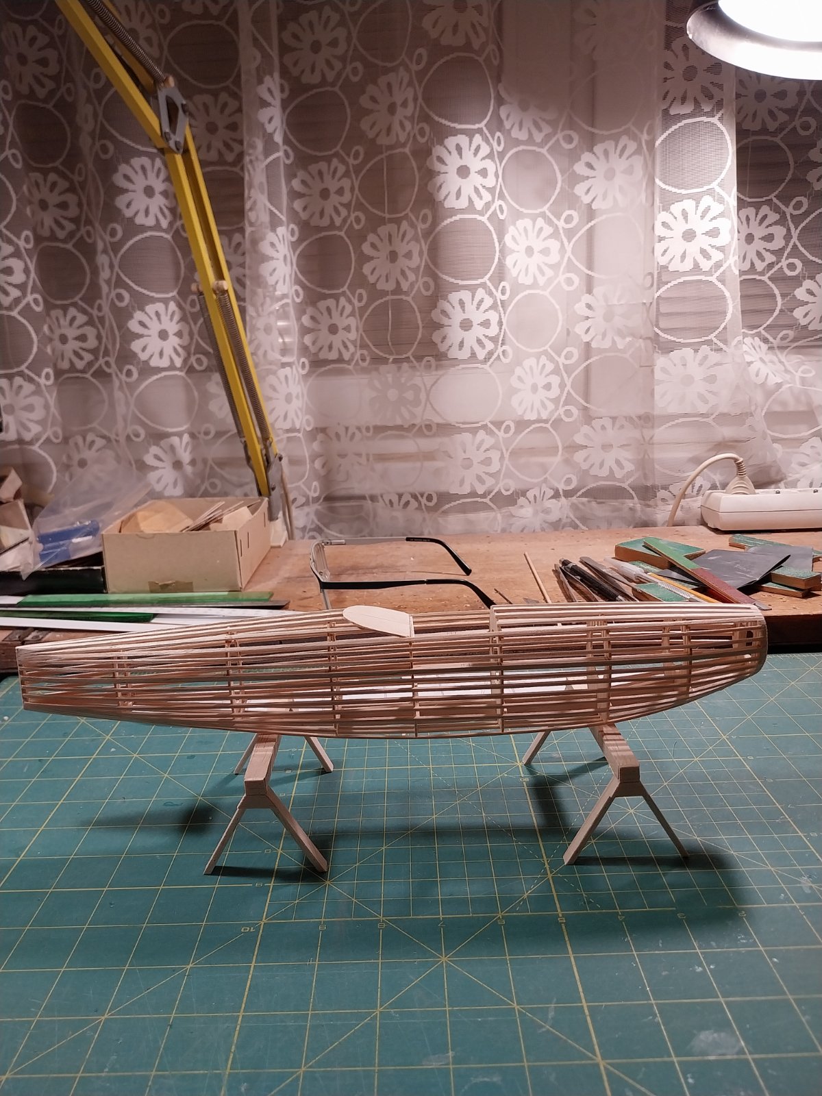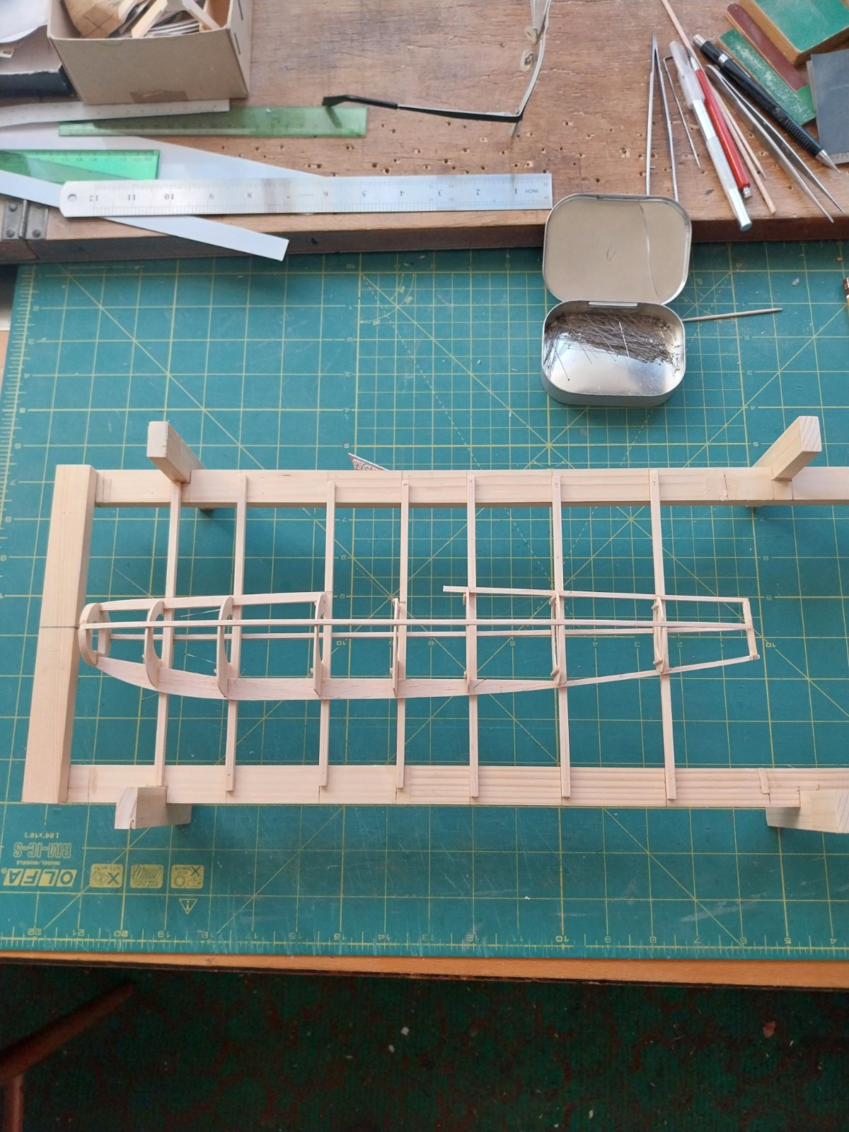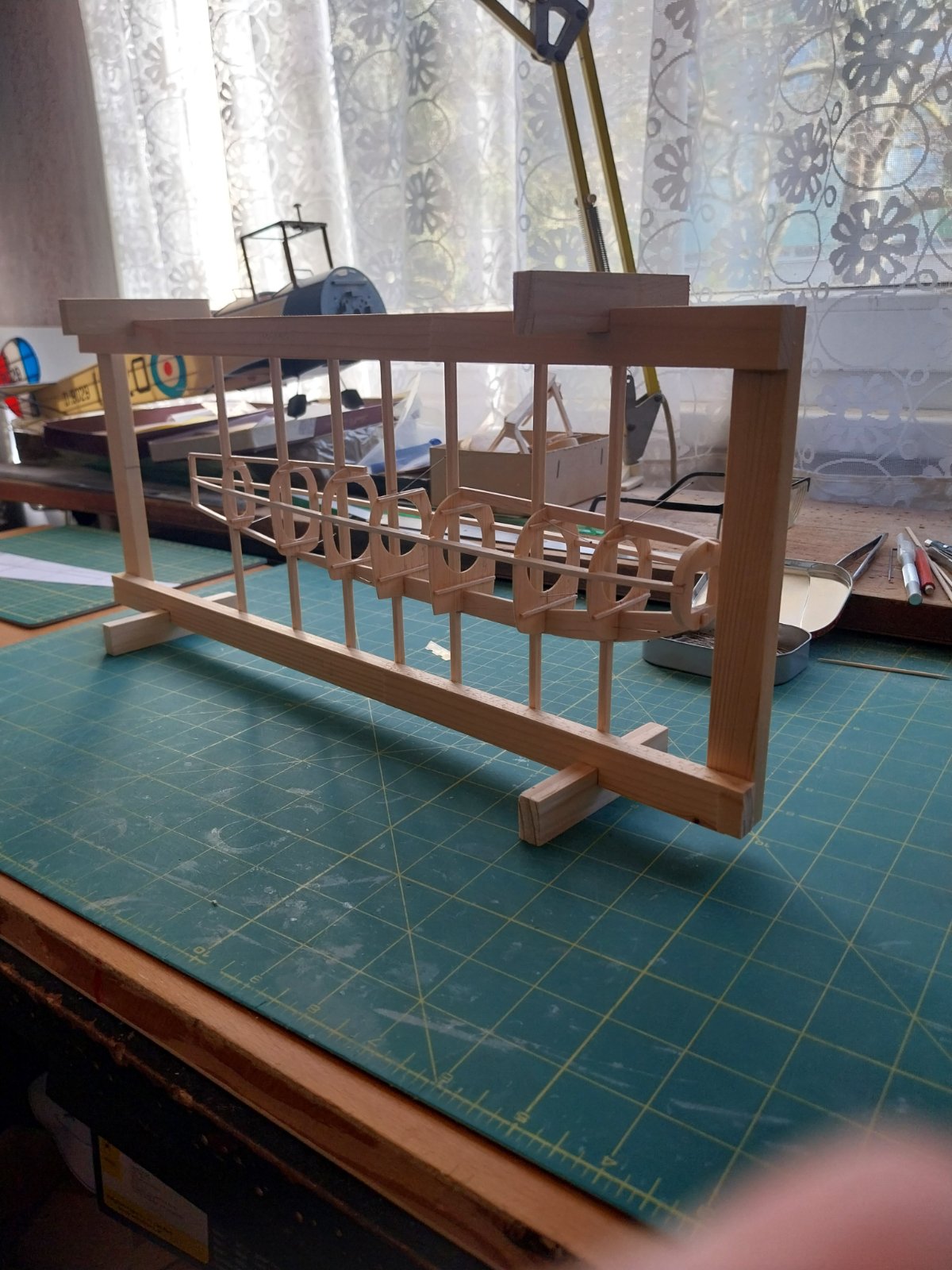 Tak jsem dožbrdlinkoval trup. Celou přední část trupu až po kabinu chci mezi žbrdlinkami vyplnit balzou 1,5 mm. Pokud najdu doma v dílně vhodnou balzu 0,8 mm tak udělám ocasní plochy podle plánku. Přípravek se osvědčil ze začátku stavby pak jsem zbytek žbrdlinek na trupu udělal v ruce