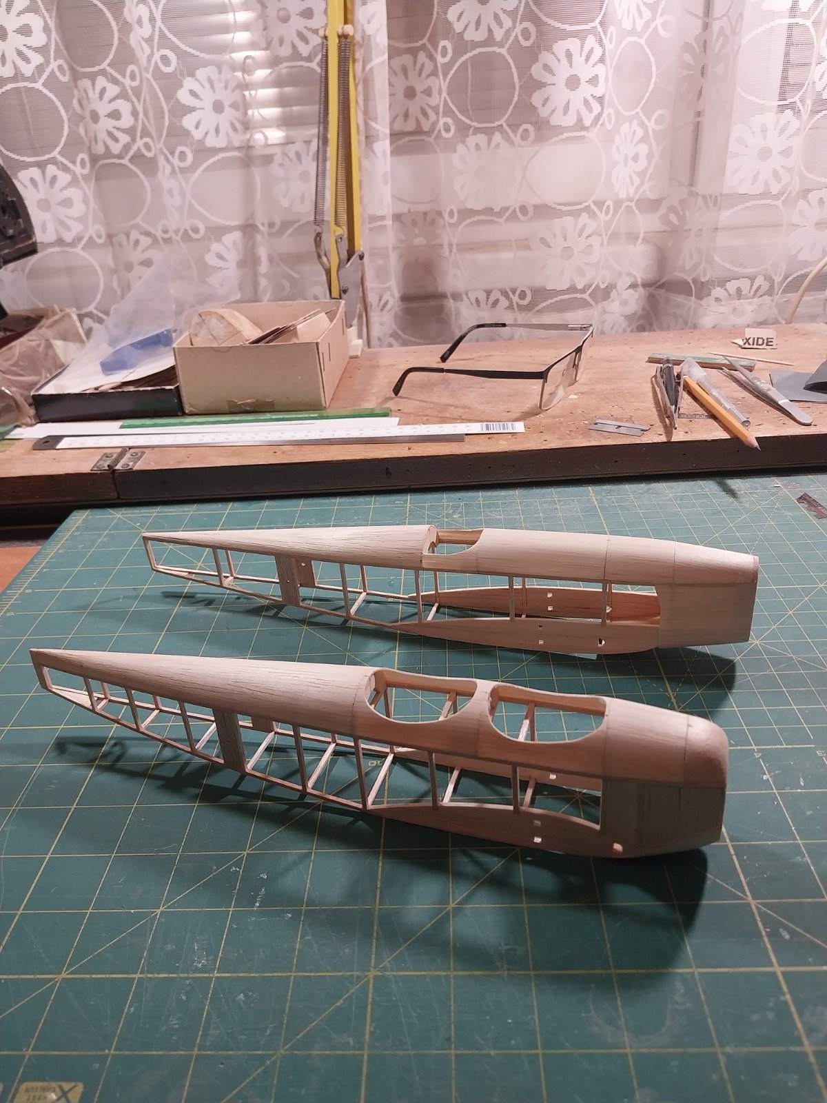 Tak jsem dokončil oba trupy na Betky. Zatím bez hlavic hmotnost Beta 56 6,5g a Beta Scolar 7g. Přední horní části trupu u obou Bet je vcelku z ohýbané balzy 0.8 mm, zádní horní části trupu u obou modelů jsou z balzy 0.8 mm -plaňkování lištama 0,8x4 mm a zbroušeno zatím na tl 0.5 mm