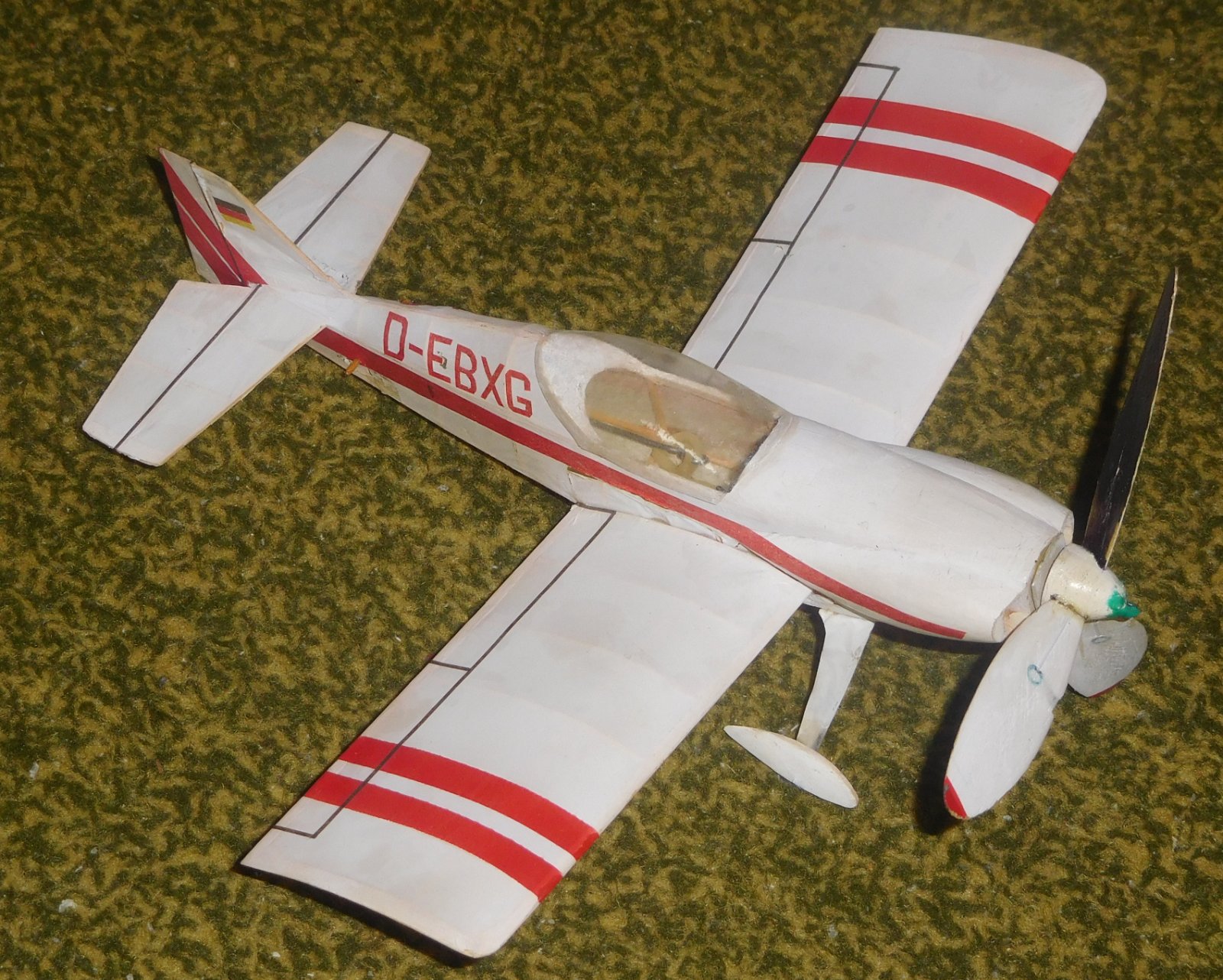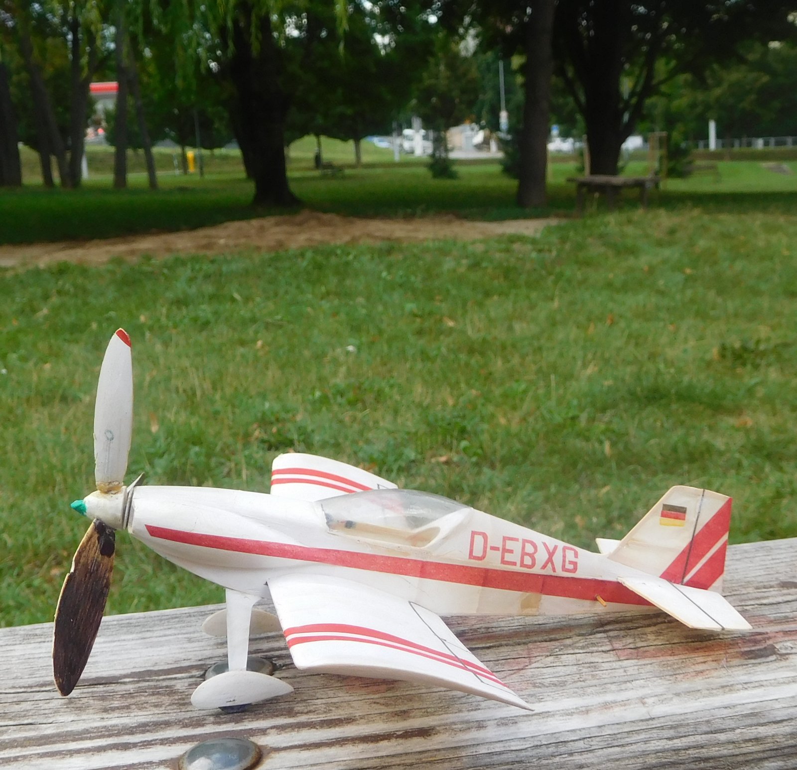 Ještě ráno pršelo, v poledbe oblašno a vítr, ale v 17 hodin zamračeno a bezvětří. Beru Hornisse s půlsvazkem o délce 170 mm 1,50 g/m do kteráho by se mělo maximálně vejít 1000 otáček. Natáčím 700 a let na nezaběhnutý svazek je ze začátku nádherný, okruhy o průměru 20m. výška 8m, ale než si připravím foťák tak přetažení a pád střemhlav, na druhý let přidávám 0.25 g plasteliny na kužel vrtule, opět točím 700, výška 7m, ale také průvan nese model ke smrku, mám nervy a fotka nestojí za nic, ale čas letu 30s je výborný. Zatáhlo se těžkým černým mrakem, hrozí déšť a začlo dost foukat, nejvyšší čas jít domů. Jenže objevil se ten muž, co mi svými trubkami nadstavil můj teleskopický prut a sundal P-5 ze stromu, chválí jak mi ten mrňous létá a já využívám příležitost, abych se zeptal, zda by mi ty trubky neprodal. On se zasmál, to nemohu, to je můj stěžeň na prkno a také by jste se nedoplatil, on stál 25000 Kč.