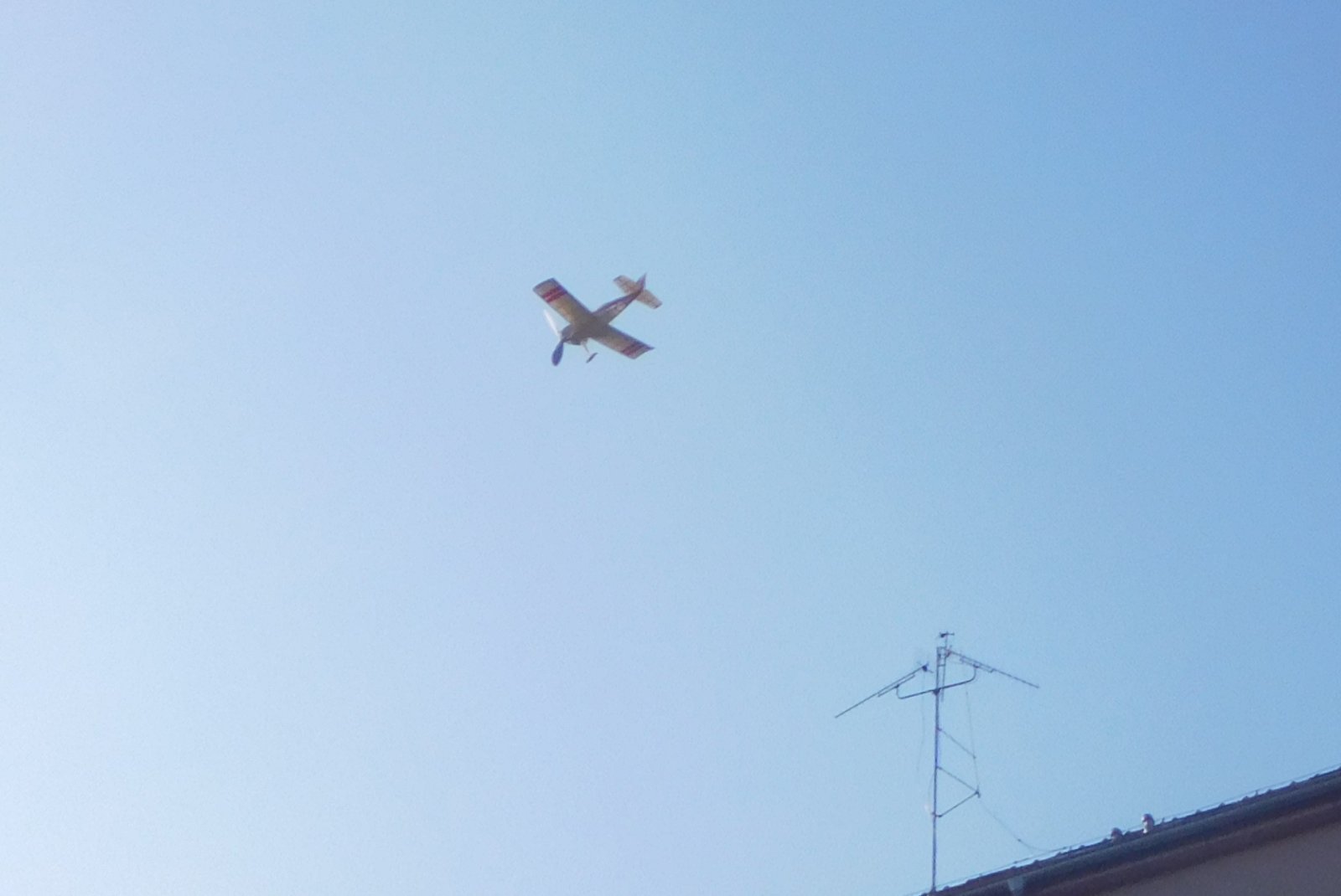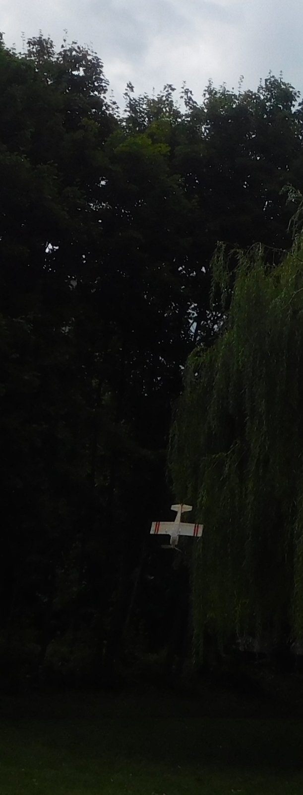 Beru tedy Pistácio Hornisse s půl svazkem a jdu na plácek, na lavičce kde natáčím a sedávám je lejno od nějakého ptáka, tak napřed uklidi,,,pak již točím 700 a chci fotit, ale vlho udělalo své, model jde do země. Dotáčím asi na 800 a silně mačkám negativ na pravém křídle, následuje parádní let ve výšce asi 9m, fotím, model po 25s zachytil o větev ořechu ve výšce 6m a padá na zem, láme si př tom list vrtule, Musím domů lepit, Za hodinu jsem znovu na plácku, při natáčení lepený spoj povolí a list odpadne, zkouším létat bez listu, ale to napřed nejde, potřeba extrémně prokroutit křídlo, srovnat SOP a pak to zase létá. Znovu děkuji Robertovi za radu s půl svazkem, ano je to bezpečné létání na malém prostoru