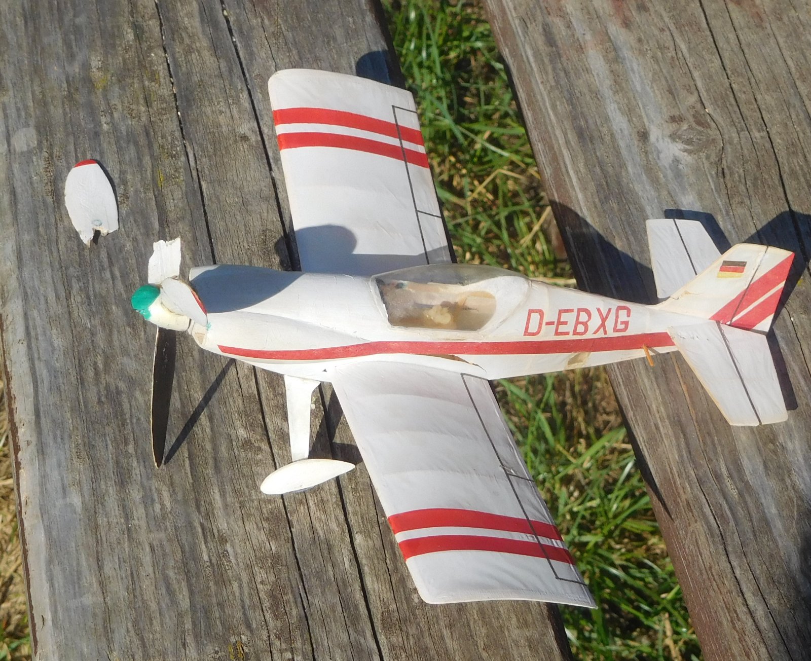 Odpoledne bylo bezvětří v 16 30 jsem vzal Hornisse a chtěl udělat hezké letové fotky. Nějak se nedařilo i když jsem tošil 700 a 800, lety byly sice dlouhé, ale zíběry nic moc. Pak praskla gumiška, já ji svázal a znofu chtěl natočit 700, jenže ona praskla znovu a tak blbě, že badělala v trupu očklivé díry, oprava pracná, výsledek negezký. Tak dopasne ten co se nespokojí s tím, že mu to hezky létá a nusí se pocchlubit.
