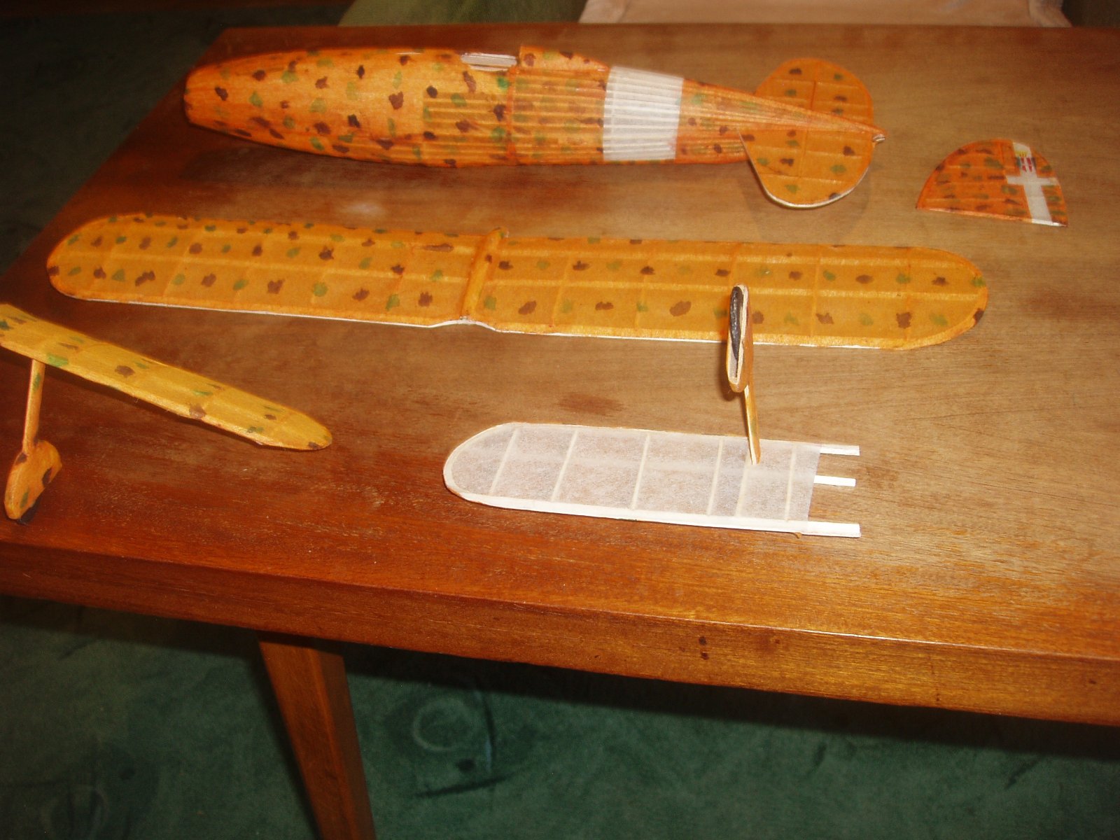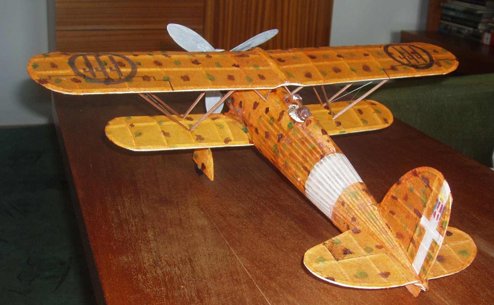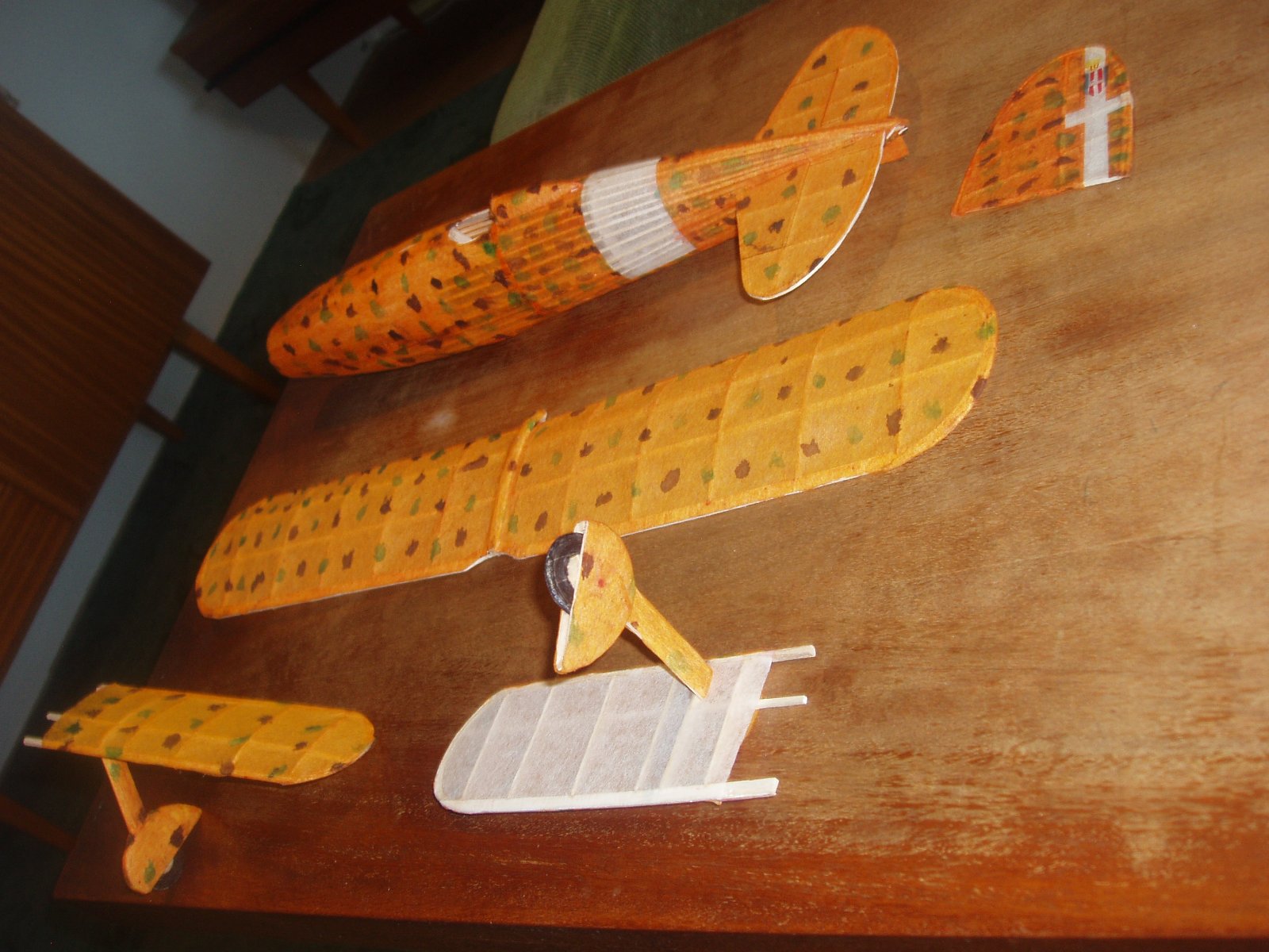 S nyní k mé dvacetince FIAT CR 42 DB. Já trouba jsem si z googlu stáhl onen barevný bokorys, kde základ je žluto/oranžový a na něm zelené a hnědé skvrny, Tak žlutý tenký modelspan jsem napřed přibarviil silně ředěnou červenou barvou, pak štětcem nadělal z anilinek ty skvrny, nyní je již potah hotový a já zjistil, že existuje jiný barevný bokorys a tam je základ jasně žlutý. Mohl jsem si odpustit ono přibarvování červeno a pak hlavně pracná potahování ztvrdlým obarveným papírem.