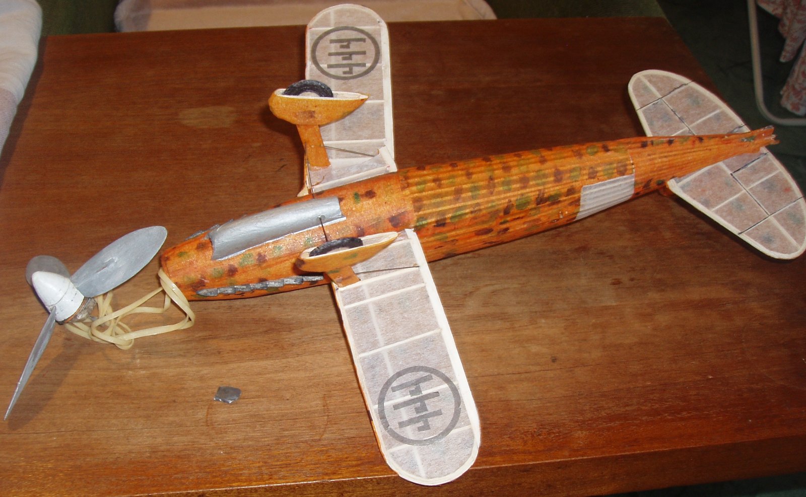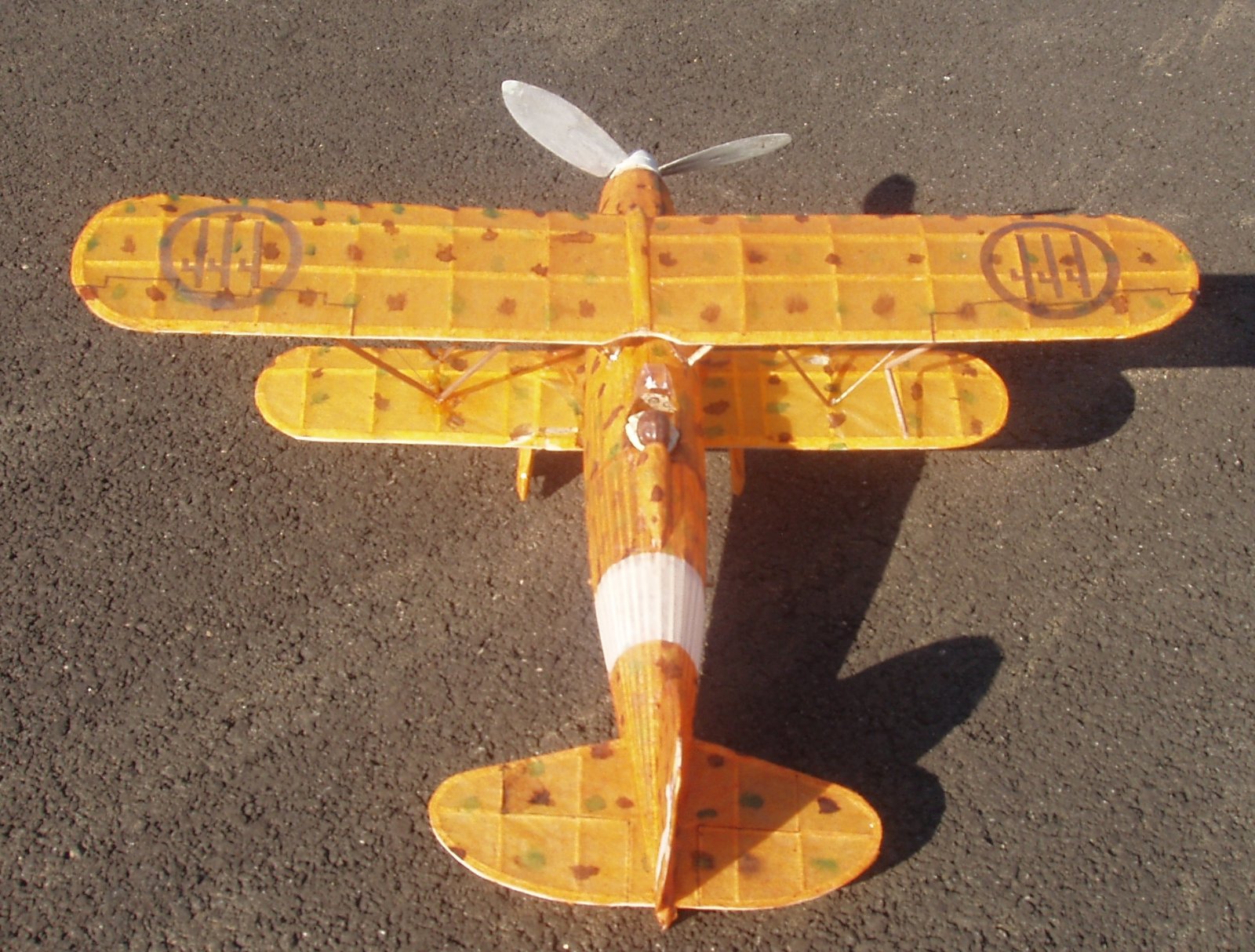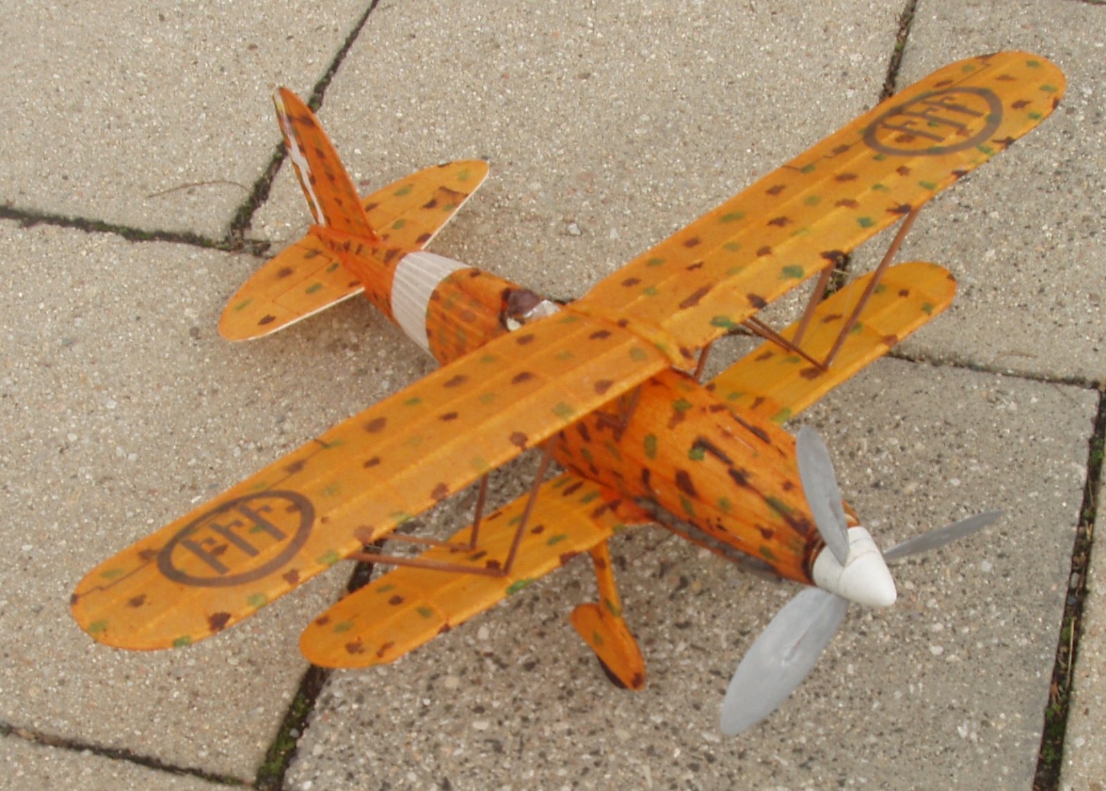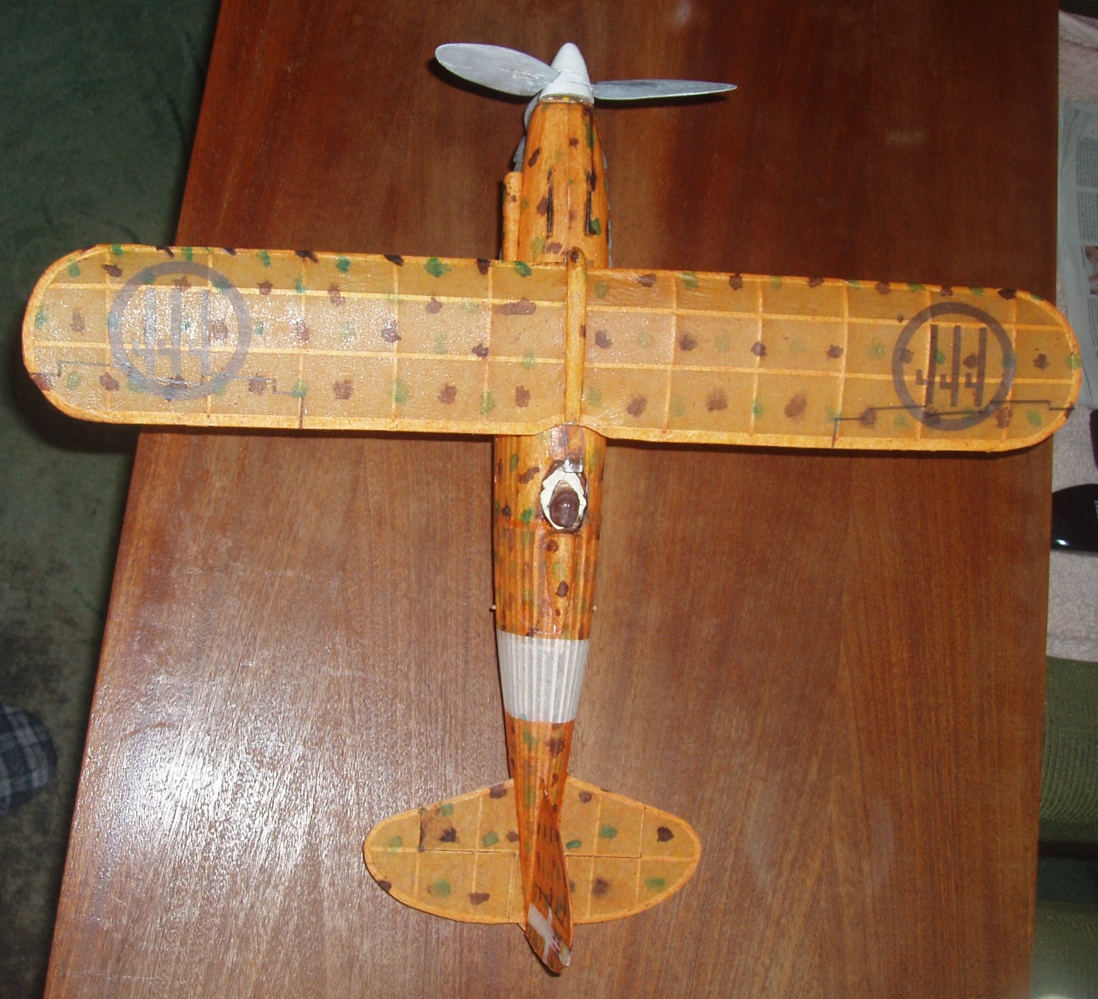 S nyní k mé dvacetince FIAT CR 42 DB. Já trouba jsem si z googlu stáhl onen barevný bokorys, kde základ je žluto/oranžový a na něm zelené a hnědé skvrny, Tak žlutý tenký modelspan jsem napřed přibarviil silně ředěnou červenou barvou, pak štětcem nadělal z anilinek ty skvrny, nyní je již potah hotový a já zjistil, že existuje jiný barevný bokorys a tam je základ jasně žlutý. Mohl jsem si odpustit ono přibarvování červeno a pak hlavně pracná potahování ztvrdlým obarveným papírem.