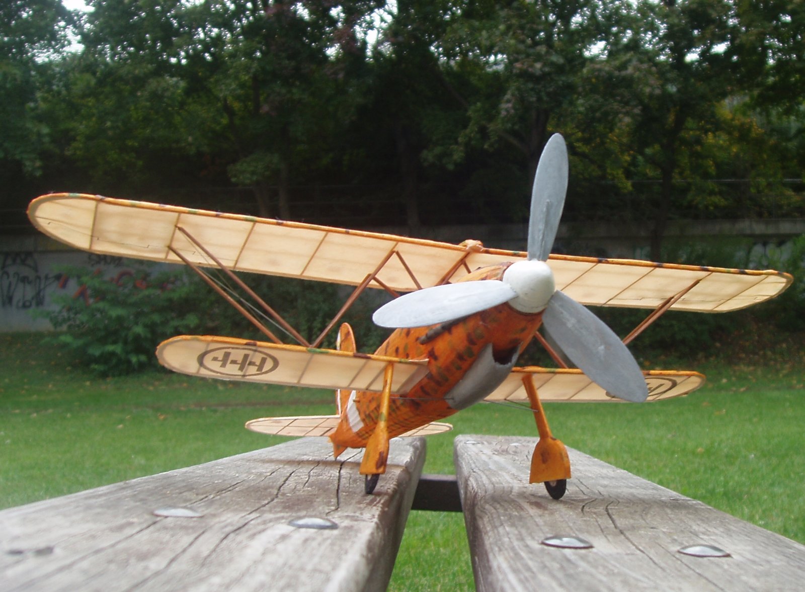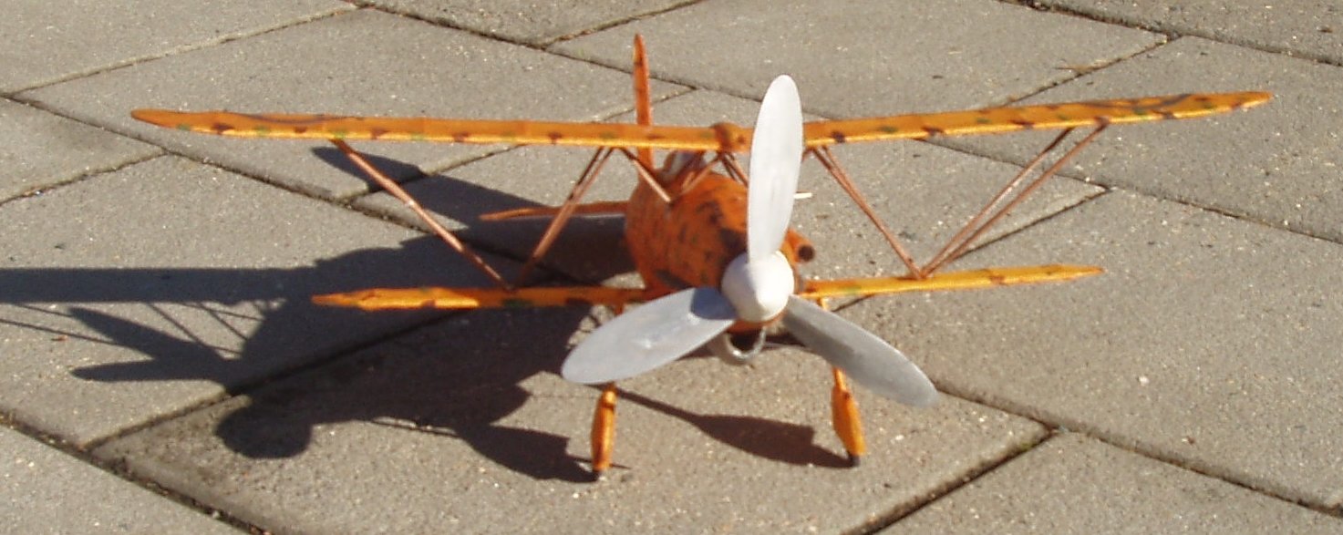 17 HODIN NEPRŠÍ NEFOUKÁ , Na plácku je nízká tráva a občasný závan. Na malé otáčky OK. Natáčím více a zkouším fotit. let ke krátký na to, abych to stihl. Beru natáčedlo a točím 700 , model vystřelii do výšky 10 m, tam se přetočil na záda a práskl sebou střemhlav do země, Totálně zničený vzpěrový systém, zlomené spodní křídlo, poškožené i horní křídlo. Zítra ae pokusím o opravy, ale je to jasné : omyl byl originální letoun. Velký omyl je i jeho dvacetinka,