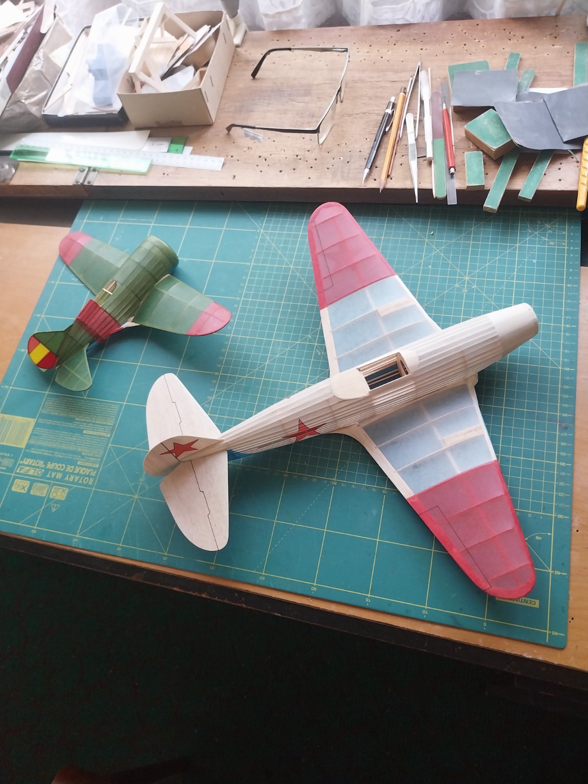 Tak jsem dnes obarvil papír na Jaka a I-16. Barvil jsem nešustivý japan 12 g co prodáva Hořejší. Světle modrou na spodek Jaka jsem zkusil stříkat hodně zředěnou modrou tuží .První menší kousky papíru dobrý ale pak jak už byl umatlaný podklad (celofán) tak už to nebylo dobré (mapy, podstříknutá tuž. Asi byla chyba že jsem stříkaný papír uchytil páskou jen v rozích. Na ostatní barvy světle šedá na I-16 a červená na hvězdy a problematické konce křídel Jaka jsem použil vykoušený a osvědčený způsob Jirky Tramfala a jsem spokojený. Další modely už budu asi jen stříkat pistolkou