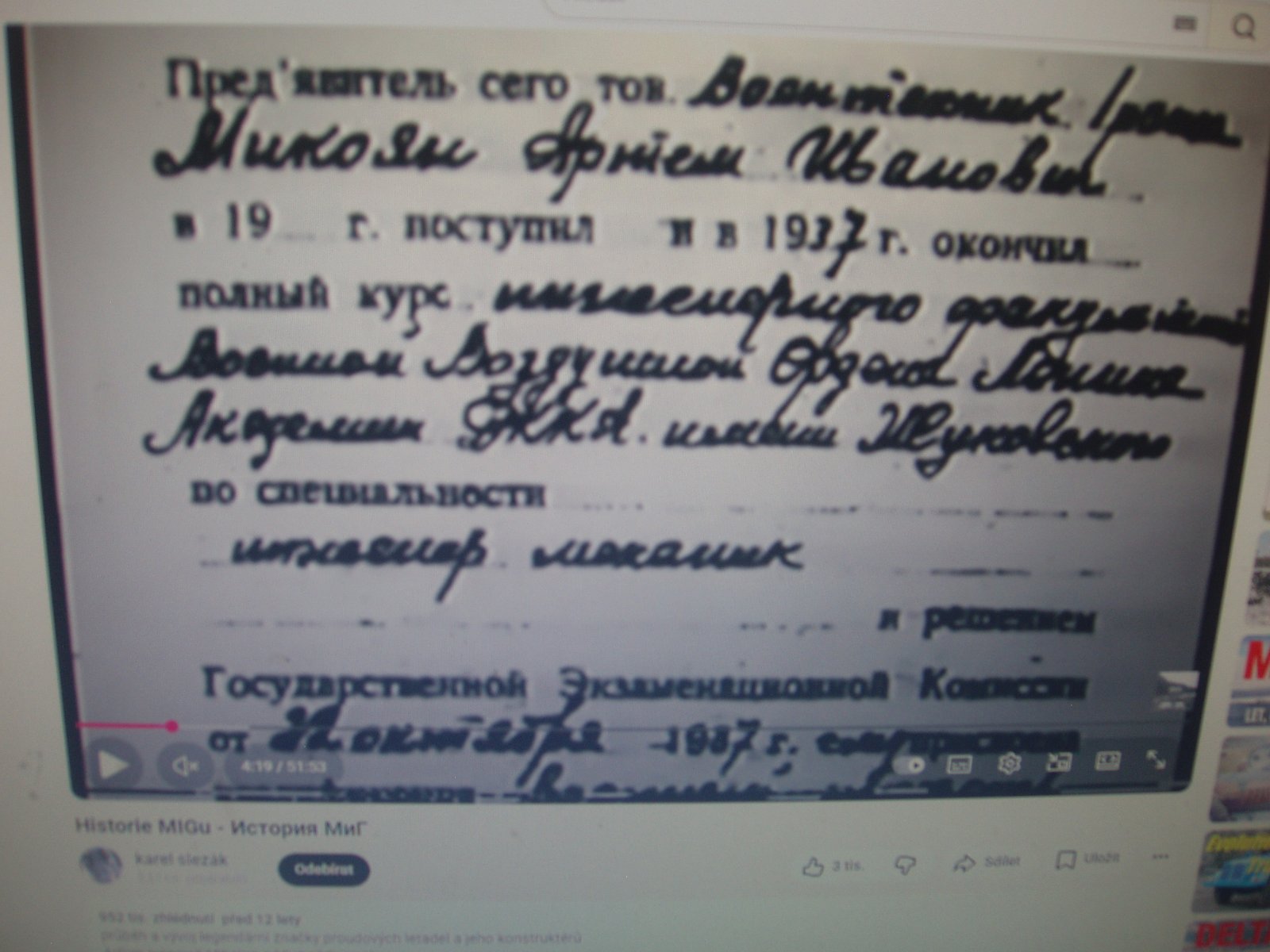 Přes Google se mi podařilo najít ono video A. Mikojana a onoho homebuilta z roku 1937, problém byl ja z videa zkopírovat fotku, Nakonec jsem ten záběr přefotil mým starým Olynpusem, jenže tomu jsem neuměl vypnout blesk. Takže fotka je tím poznamenaná.