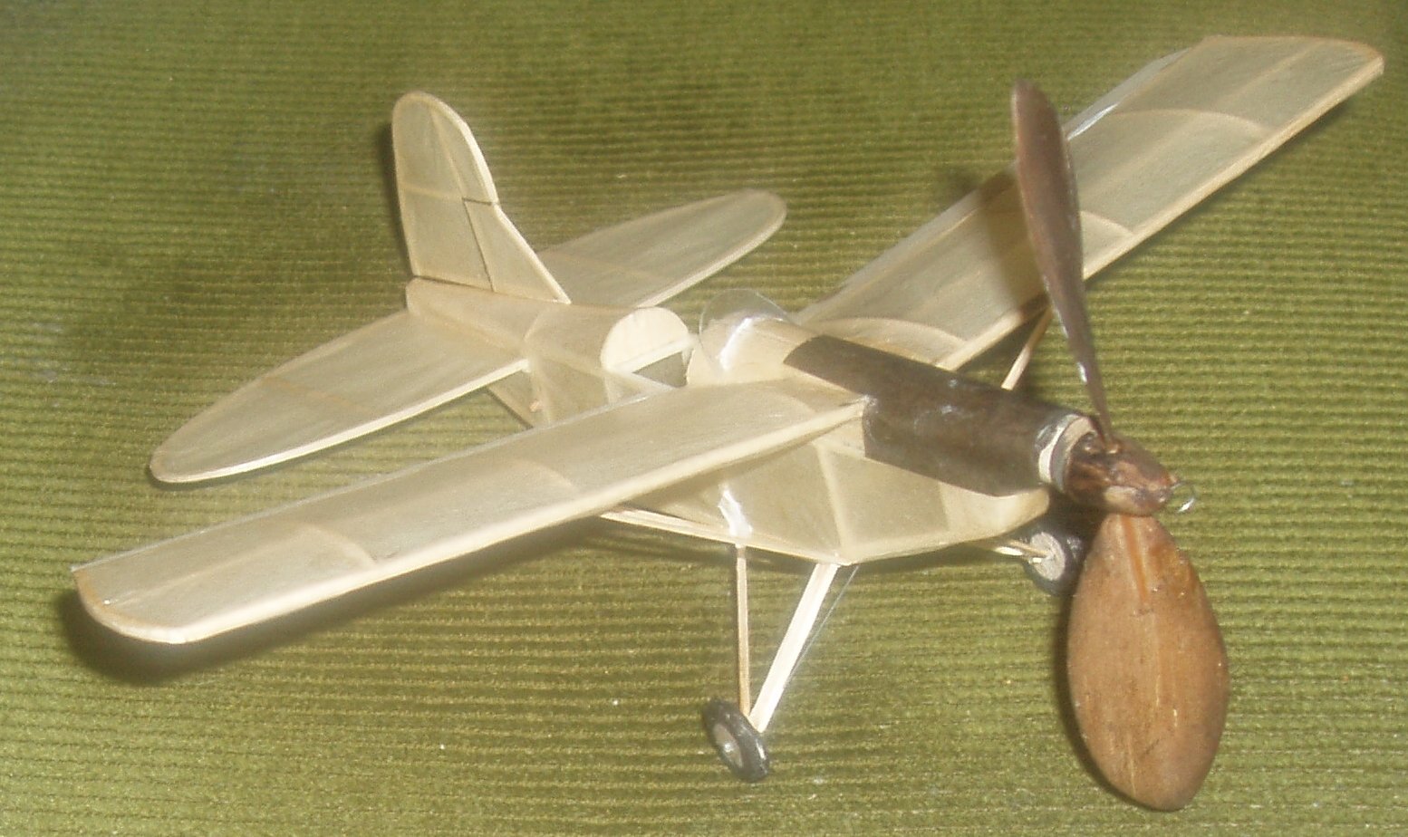 Dbes ráno v 9 hodin teplota 16C bezvětř a na plácku slabá rosa. Při natáčení na 900 otáček z nosu modelu odpadla šupinka balzy. Hned to bylo poznat a po 15m letu opět lomcovák, postupně dovažováno plastelinou až na 0, 33 g, pak sice model stabilní, ale přistává s velkým zbytkem otáček, lety kolem 20 s. Rozhodl jsem se pořádně natočit a přidat zatáčky nakroucením SOP, na 1200 otáček rychlý výstup do výšky asi 15m, velký okruh. let nad smuteční vrbou a pak ve velké výši těsně kolem smrku, ano nebylo to ani 1m od nejvyšší větve,další okruh za již pokleslého momentu svazku byl klesavá a přistání po 45s přímo pod tím smrkem. Extrapolací lzs odhadnout, ře při natočení 1500 obrátek by výška byla kolem 20m a čas kolem minuty. mám pocit, že drsnější povrch polystarenového křídla se chová, jako by to křídlo bylo větší a to nejen u tohoto modelu.