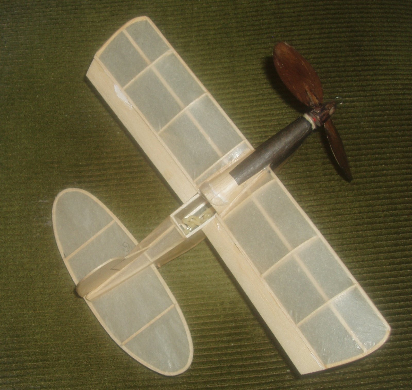 Odpoledne ve 14 hodin je zataženo bezvětří a 25 C. V modelu je tenčí svazek L= 260 mm 0,7 g, tedy 1,36 g/m do kterého lze maximálně natočit 1860.Točím hned 1200 a po startu je model silně na levém křídle, dva prudké okruhy ve výšce 1m, pak otevření zatáčky nastoupání do 2m a rovný let do parčíku, přistání ua 35s s obrovským zbytkem otáček, svazek je slabý. Cestou domů na parkovišti zkouším start ze země, točím 1400 model se rozbíhá se silným náklonem doleva, pak dva okamžiky kdy se na kousek odlepí, ale v zápětí škrtne o asfalt křídlem a dál jen jezdí, Na pořádný start ze země bude potřebovat svazek alespoň 1,5 g/m.