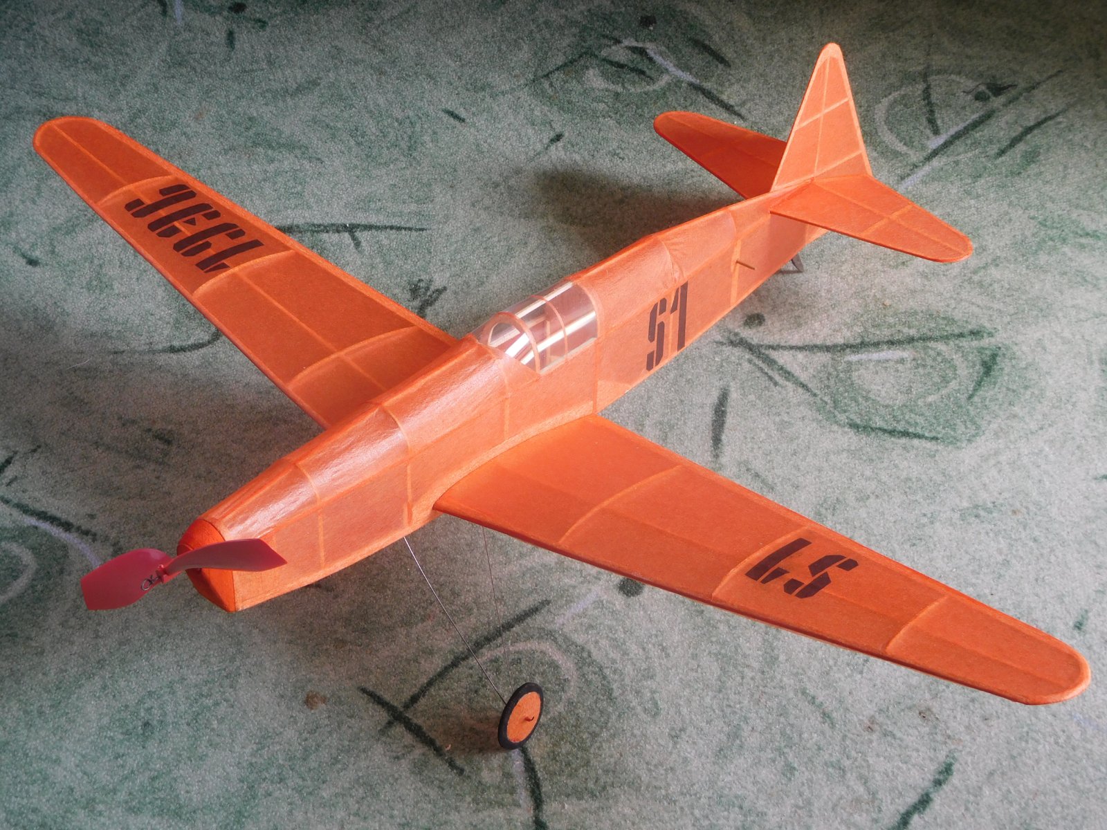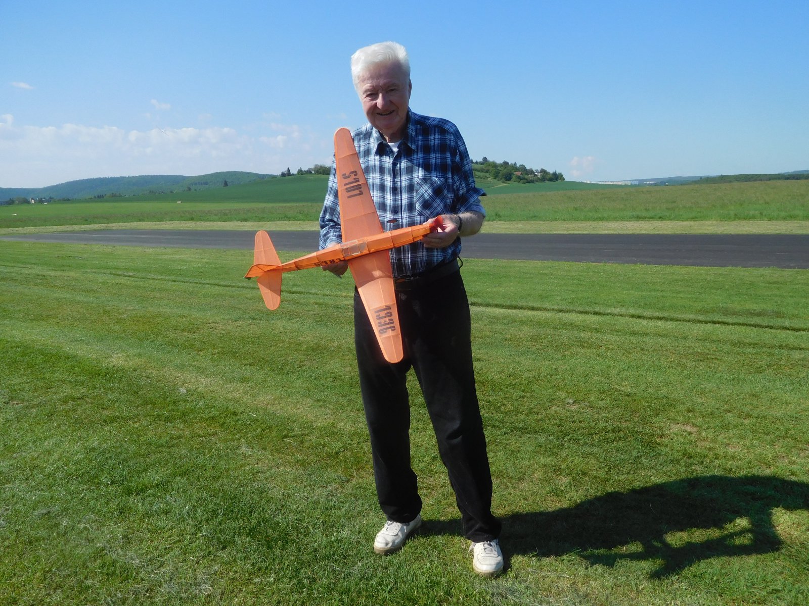 Včera bylo nádherné počasí, ráno jsem si vzal i tenkou bundu (na internetu bylo 12C), ale venku pralo slunko a bunda byla zbytečná, o deváté bylo na Medlánkách bezvětří, které nalákalo spoustu modelářů hlavně s RC modely. Já jsem se usadil u stolku Tondy Pospíchala, který mi mezi starty svých RC dělal pomocníka s mými gumáčly. První pokusy s novým S-101 byly krátké a přízemní, natažení VOP nepomáhalo a tak jsem na směrovku namáčknul 2,5g plasteliny a hned z toho byl úplně jiný model, na 1200 otáček nastoupal 50 m výšky a letěl 80 s. velký aplaus a otázka jaké je pro BV.min maximum no 60s. Na další let točím 1500, tedy 75% z maxima a model nejenže má po minutě přes 60m vžšky, ale již si tam našel pěkný stoupák a přesouvá se směrem k hangárům. Dotazy máš tam deter a adresu? Přiznávám, že ani jedno, naštěstí po konci motoru model začal houpat a sestup byl směrem nazpět, takže jsem se jen trochu proběhl, Tonda říká, dej model do krabice a nelétej s ním dokud nebude mít deter a adresu s číslem tvého mobilu !Stalo se, jen s tím deterem byl problém, který jsem nakonec vyřešil zátěží na silonu přes celý trup přivázaný k SOPa v předu gunička s doutnákem- Pak ještě pár letů s modelem F1G na gumu 5 let starou a šlo se domů, Počasí na kraťasy, a brzy znovu na letiště vyzkoušet jak deter funguje,