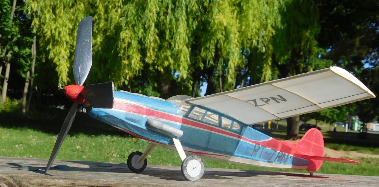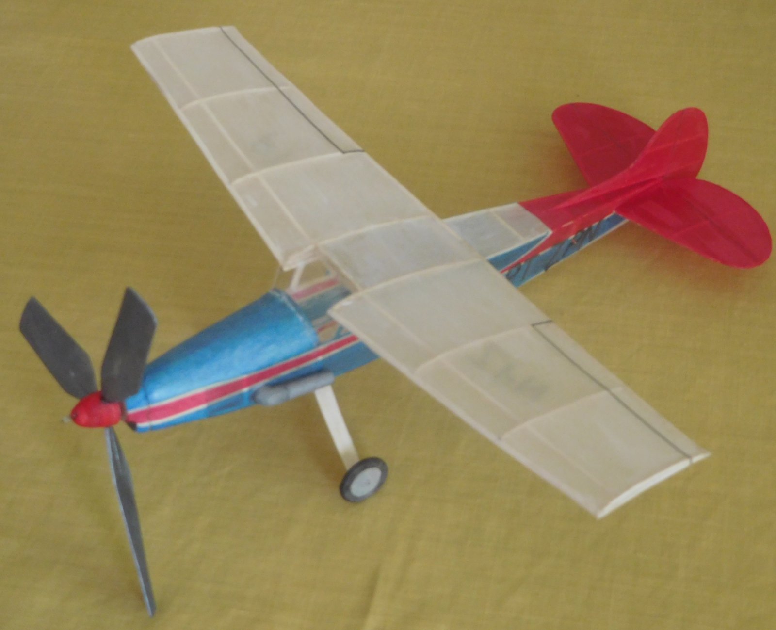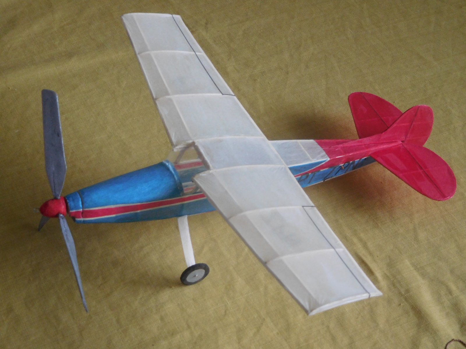 Před dvěma roky jsem vyhodil kompresor z ledničky, Takže složité barevné pruhy na trupu a imatrikulaci jsem musel dělat z barevných plyspane, někde to musí být i dvě vrstvy. Výsledkem pak je prázdná váha 8,8 g.Velká třílistá vrtule bude potřebovat mohutnější svazek takže letoví bude něškde mezi 11 až 12 g.
