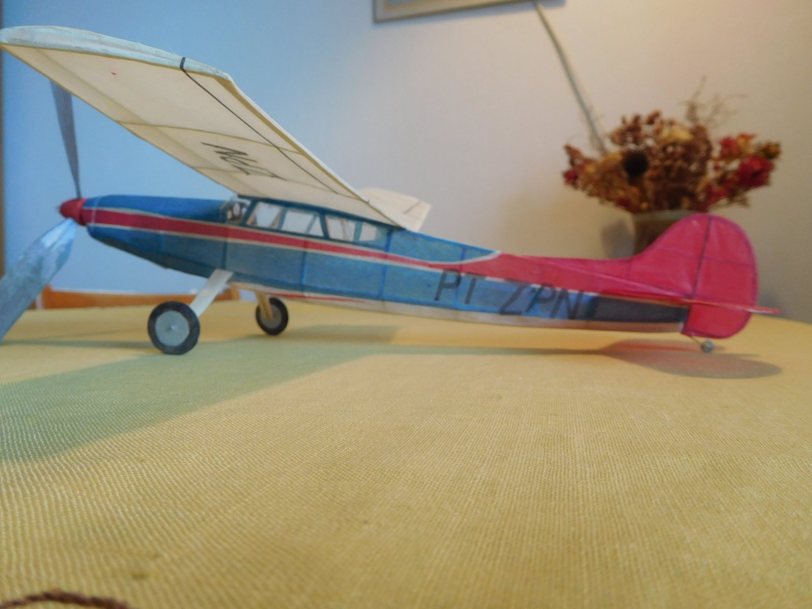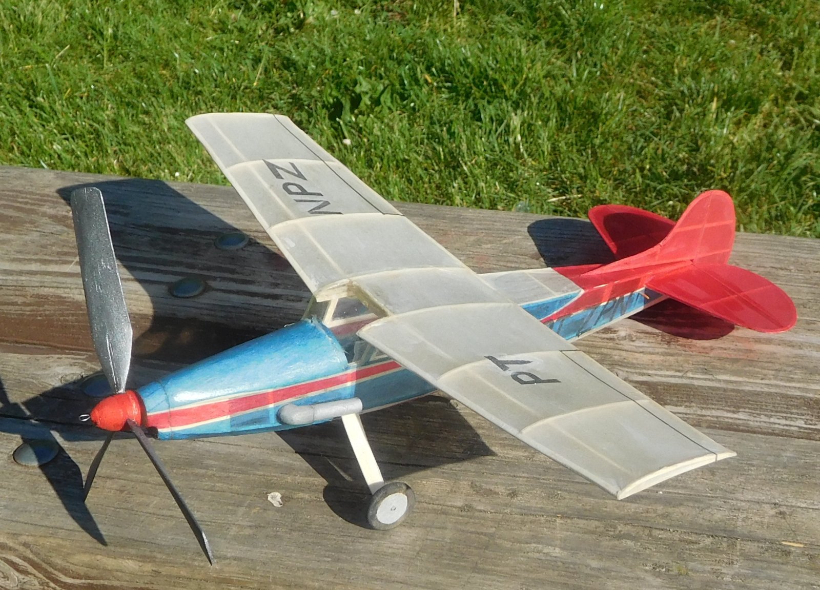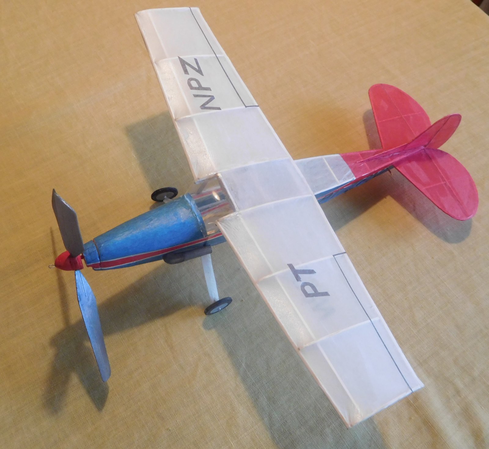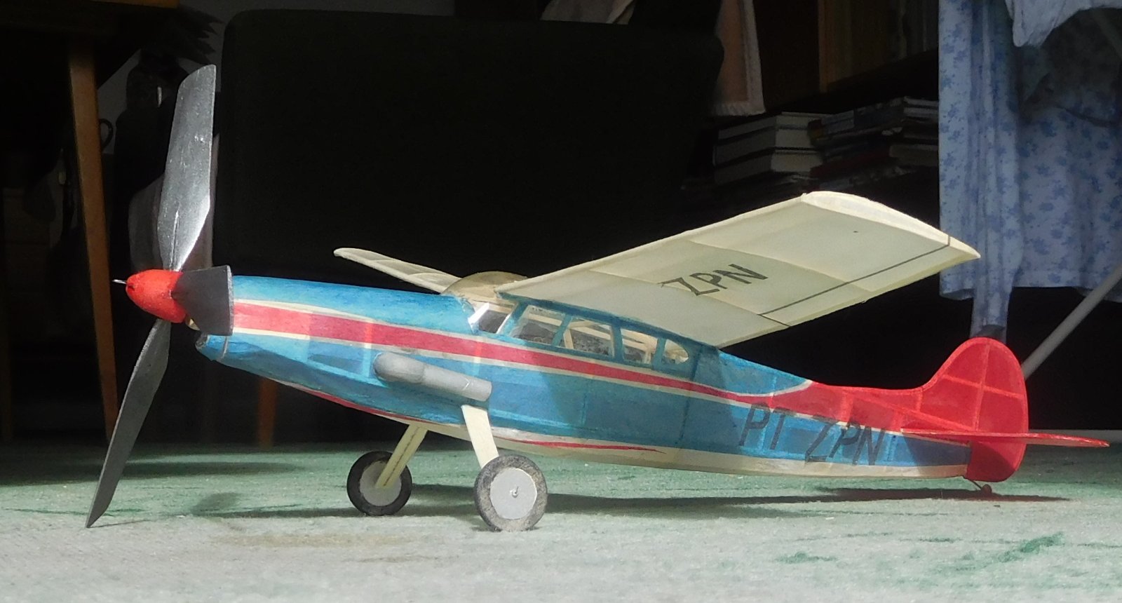 Před dvěma roky jsem vyhodil kompresor z ledničky, Takže složité barevné pruhy na trupu a imatrikulaci jsem musel dělat z barevných plyspane, někde to musí být i dvě vrstvy. Výsledkem pak je prázdná váha 8,8 g.Velká třílistá vrtule bude potřebovat mohutnější svazek takže letoví bude něškde mezi 11 až 12 g.