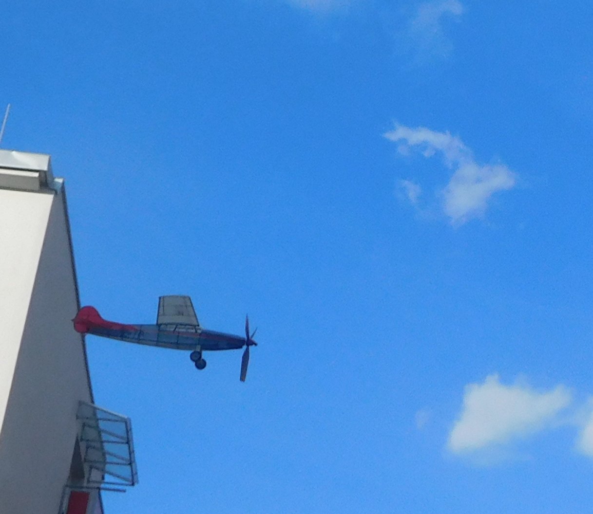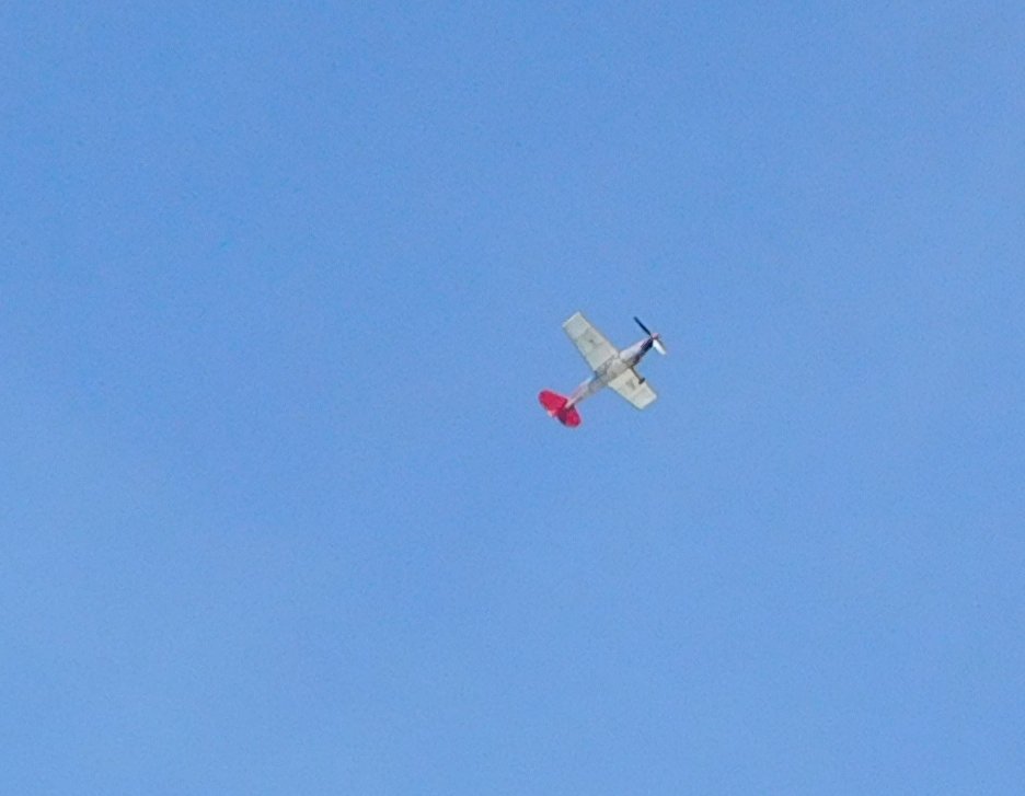 Dnes je po dlouhé době podvěčer bezvětří a tak jsem to musel využit. Je poznat, že SOP je řádně zalepena, Model létí pravidelné levé okruhy o průměru 50 m které ke konci otevírá na přímý let končící v parku. Takže došlo na Jirkovu radu, měl jsem sebou žiletku a ta pogložka byla za moment pryč, První let na 500 otáček byl lehce houpající okruh cca 30 průměr. Srovnáván SOP a přidáván 0,3 g plasteliny na kužel vrtule, připravuji foťák a točím 900- moc pějný let do výšky 6m průměr zatáčky 25 m a povedla se i jedna fotka. Tak točím 1200 více si netroufám svazek má již asi 50 natočení, perfektní let, výška 8m průměr zatáčky 20 m čas asi minuta, ke konci letu slabý průvan zanesl model k mladým manželům s košárkem, kteří se diví jak je model lehký. Naprostá spokojenost. Možná nový svazek by mohl bý jen 400 mm dlouhý a model létat bez plasteliny.