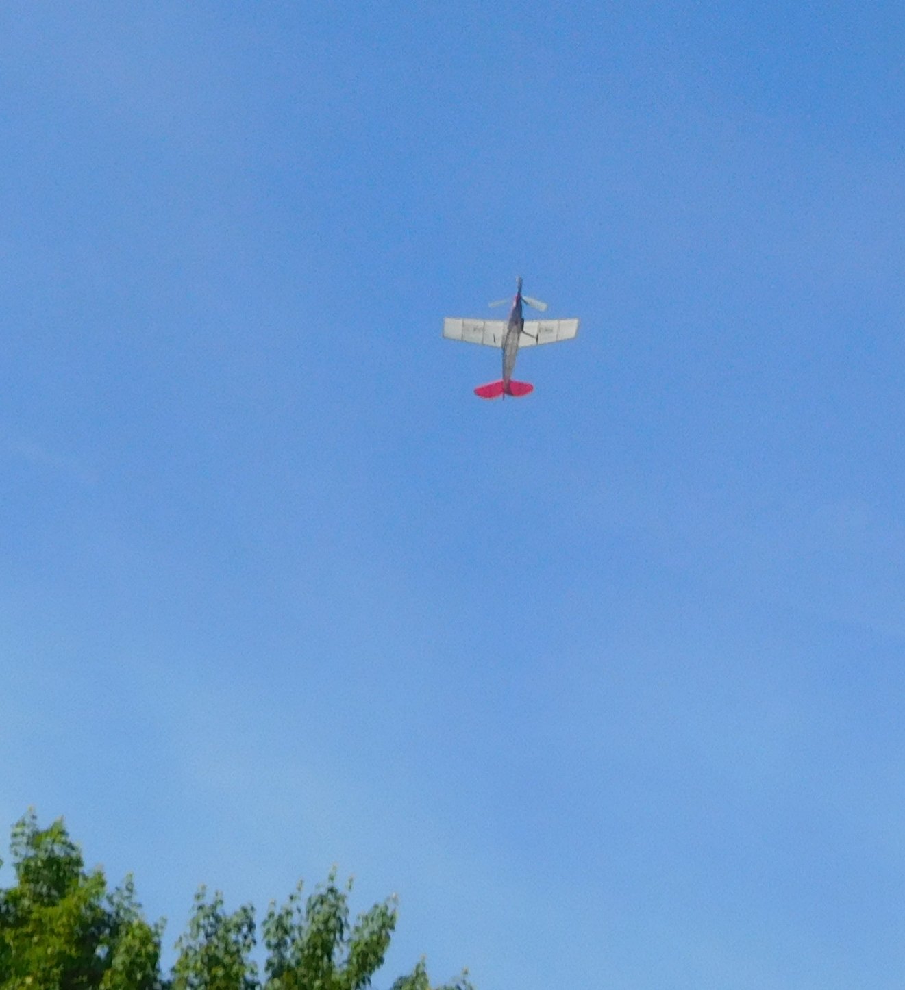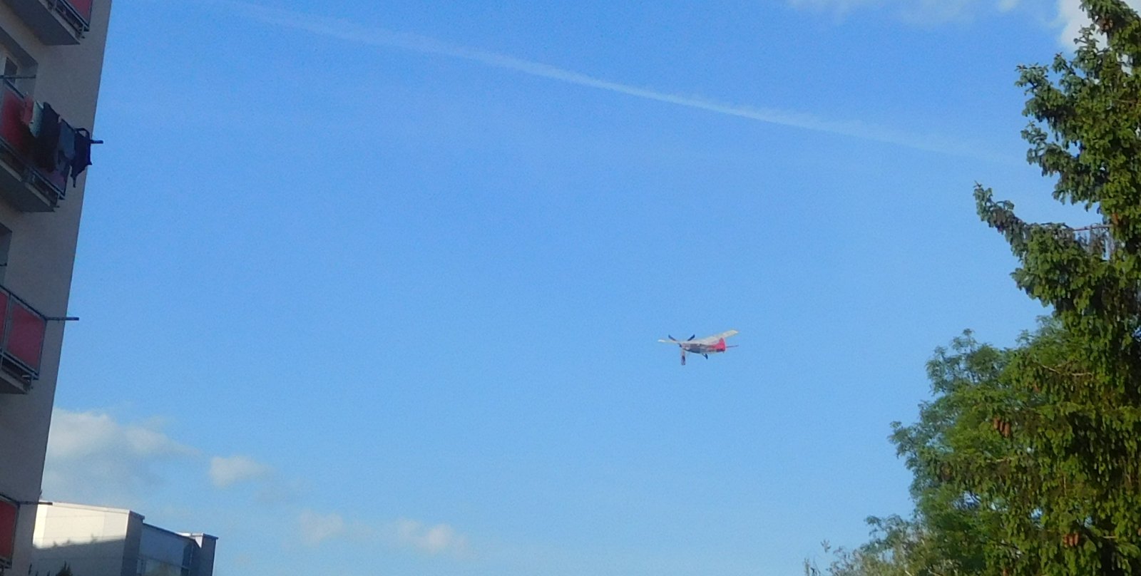 Nový svazek guma Střítecký K= 11 tvrdší smyčka l=430 2,2 G, 2,6 g/m Nmax 2020 ot při 25st C. Dnes réno v 8 hodin bylo bezvětří teplota 13 st C bez rosy. Točím 500 dovařuji plastelinou 0,3 g na kužel a startují hezký letm výška 5m a jedna fotka. Druhý let na 800 výška 8m a po 40s náraz do zdi u dálničního přivaděče. ta by mohlo stačit, ale nestačilo, takže točím 900 a start hodně v levo co možná nejdál od vysokých stromů a dálničního přivaděče, nádherný let, výška 10m model točí zatáčky o průměru asi 15m a nebezpečně se přiblížil k vysokým smrkům, 3x je těsně minul, ale počtvrté zůstal na smrku ve výšce 10m to byo asi 45s, takže motor končil. Bylo problém vůbec model ze spodu zahlédnout, Jdo domů pro teleskopickou tyč a cestou beri bezový prut o délce asi 2,5mtu tyč v délce 4m spojím s prutem a s mojí rukou dosáhnu asi jen 1m pod model. Myslím, že se třeba najde mladík, který by na smrk vylez, nebo vystřelím hapunu na dlouhém silonu tak že ta přelétne pře tu větev co na ní model je a pak tím silonem větví zatřep, nebo model shrnu, jenže po až odpoledne, nyní musím na finanční úřad kde stojím hodinu ve frontě, pak nákup a vracím se kolem poledne k obědu, ještě cestou se podívám ke smrku, zda vítr neshodil model dolů, dívám se nahoru a nic nedidím, pak objevuji mode na větvi ve výšce asi 6m. Ano vítr mi pomohl a tak ten trup navazuji tenkými větvičkami ze smuteční vrby na metrovou tyč od smetáku a opatrně dostávám nepoškozený model dolů,