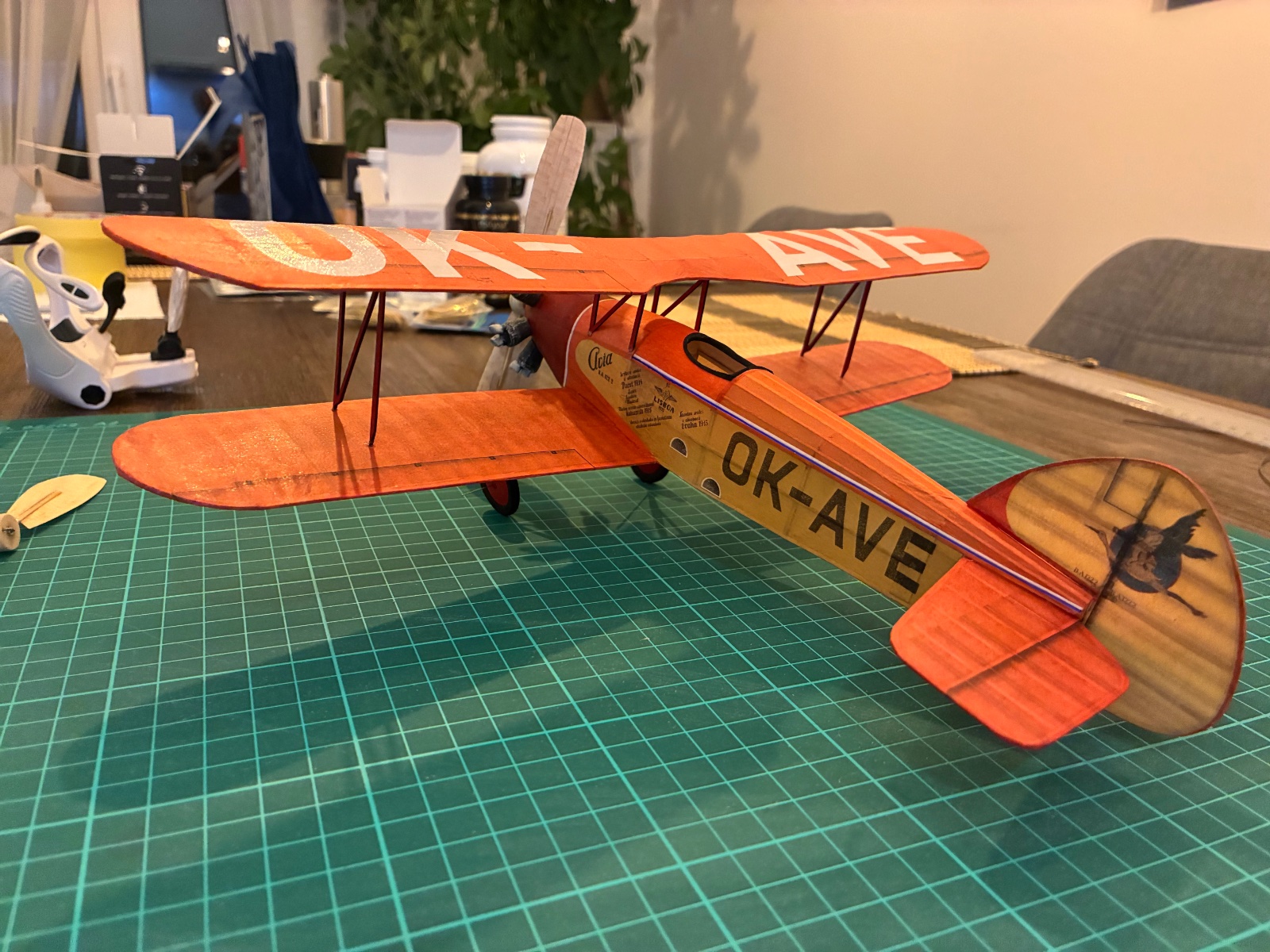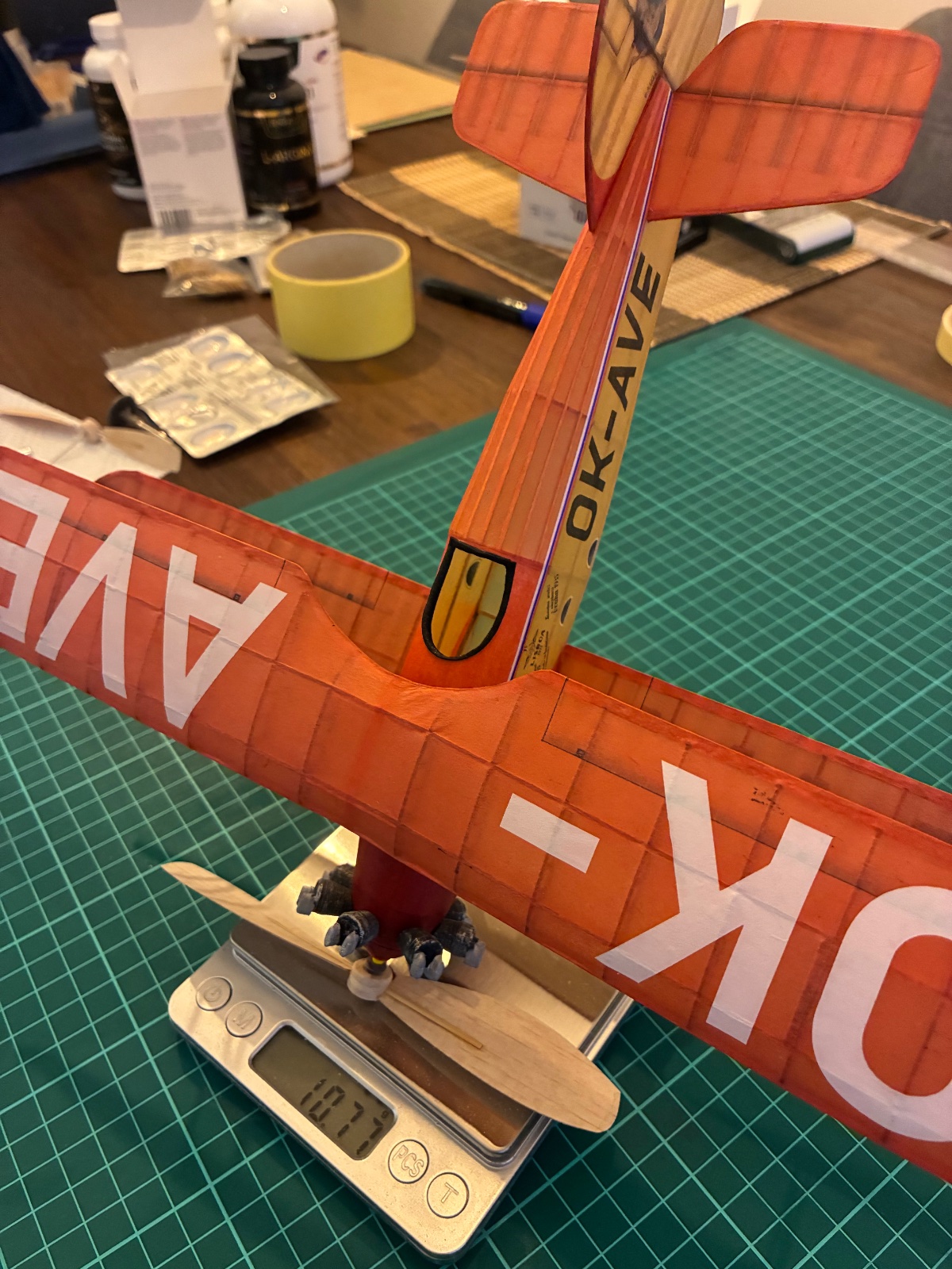 Vím ze bych s těma fotkami už měl přestat, ale tady je stav, kdy tomu chybí už jen větrný štítek. Kola jsou předělaná a je nasazena vrtule č.2 a teď se ptám: jak a kde to zalétat? Snahy o klouzání to projevuje, tak jsem si koupil gumu 1x1,5 a měl bych zájem to zkusit. Finální váha 11g bez gumy.