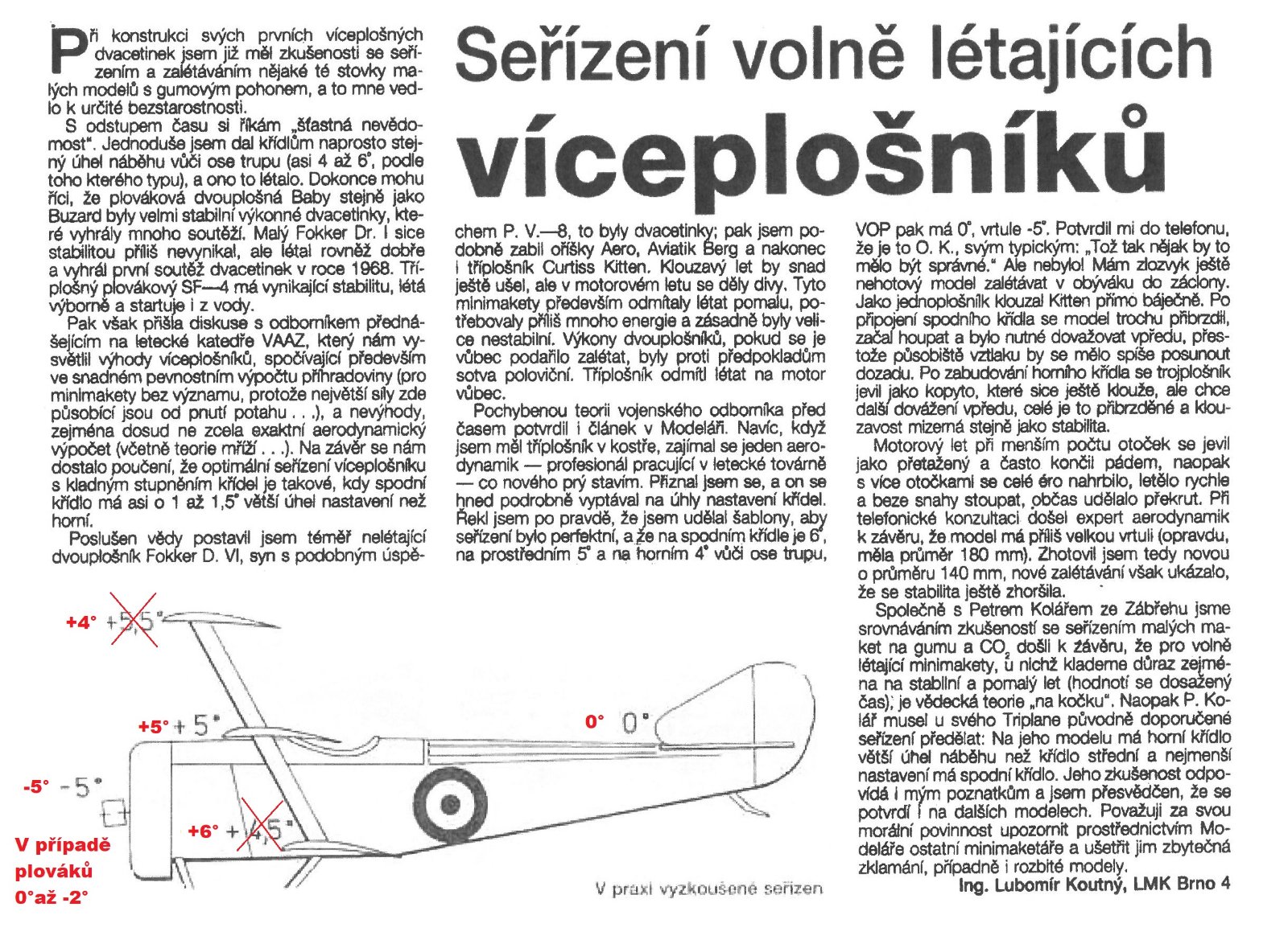 Je otázkou zda dáváme přednost největší účinnosti vztlakového systému, nebo upřednostňujeme stabilitu. V prvním případě platí to, co u velkých letounů, tedy u stupněných víceplošníků při kladném stupnění má mít spodní křídlo větší úhel náběhu než horní. To platí i pro RC. které za letu řídíš. Ovšem, jedná li se o malou volně létajíci minimaketu je-li stupnění výrazné a malá velikost násobku délky ramene a plochy VOP, pak mohou být velké problémy se stabilitou a je lépe dát oběma křídlům stejný úhel náběhu. U mé první dvacetinky Fokker Dr I jsem proto dal všem třem křídlům stejný úhel náběhu a kupodivu zvládl jej zalétat tak dobře, že vyhrál hned první soutěž. Létal tak, že po startu strmě stoupal a po krátkém motoru v dost velké výšce (a to i po startu ze stolu), pak přešel do klouzavého letu, časy byly kolem 35s. Ovšem jiní hoši asi měli jiné seřízení a zcela jiný styl letu, například Křivákův létal poměrně divokou úzkou stoupavou spirálu.