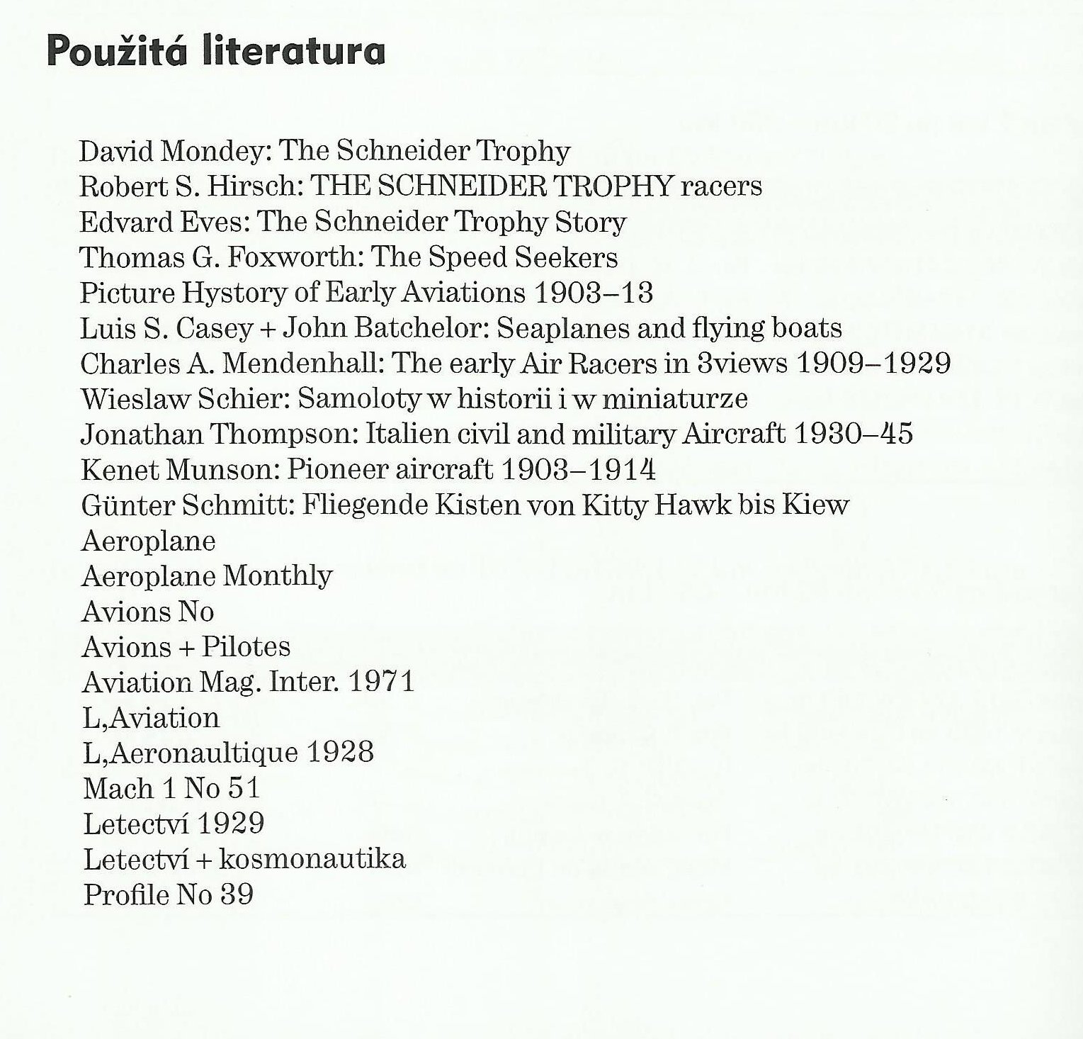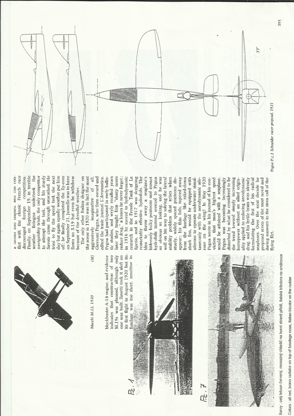 Něco málo k podkladům na letoun Pengna P.c.1. pokud jde o barvy, pak lze předpokládat, , že celý letoun podobně jako i P.c. 7 byl červený s italskou trukolorou na směrovce (oproti P.c. 7 však bez mosazných chladičů na křídle, ty byly jen na horní straně přídě). Snad perfekcionisty potěší, že existuje i jedna mizernaá fotka tohoto letounu, kterou přikládám. Něco z historie tohoto typu se dočtete v mé knize Schneiderův pohár. Použitá literatura je velmi obsáhlá, sháněl jsem podklady asi 20 let, takže neúplnou část zde přikládám. Možná více byse našlo v knize, kterou vlastní Jirka Doležel a kde jsou u třípohledy od mnoha Pegnových projektů. Také na internetu nakdete americký výkres peanuta tohoto typu a bary jsou zede uvedené v souladu s tím, co jsem uvedl v úvodu.