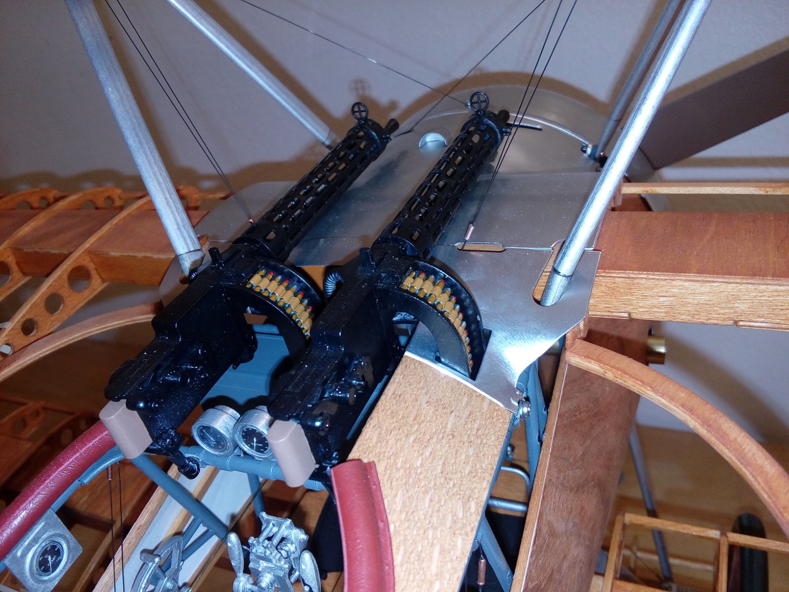 Já jsem aspoň a to dost přesnou repliku viděl před pár lety v Pardubicích na Aviatické pouti . Vidět to létat s rotačním motorem a cítit při startu ricinový olej je úplně něco jiného než repliky s pevným motorem . Posílám pár fotek detailů okolo přechodu křídlo trup . Je to s plechu . Já to mám zjednodušený , zakrývají to trochu stejně kulomety .