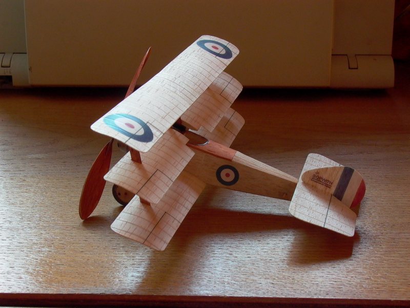 U modelů z První války je vhodné naznačit žebra plasticky skutečnými pásky. (Jiné možnosti: tuš před nástřikem, podstříknutí tmavší barvou, stínování po nástřiku.) Barevný japan, či jiný lesklý papír (S.E.5a - černá, Triplane - béžová) řežu rovnou ze složeného archu ostrou žiletkou po čtyřech páscích najednou na kancelářském papíře připevněném na skle. (Pórovité vláknité papíry se krabatí, musíme je předem láknout.) Ještě před vyříznutím obmázneme nakreslené díly dokola lepidlem typu Scotch a usadíme pásky, pak prolakujeme, japan spíše "podlakujeme", opravujeme ředidlem, u krajů dílu více laku, necháme vyschnout - opět rovná podložka a zátěž, vyřízneme díly a dobrousíme. Okraje křídel a ocasních ploch můžeme lehce napustit řídkým vteřiňákem - kvůli pozdějším "úrazům" modelu.