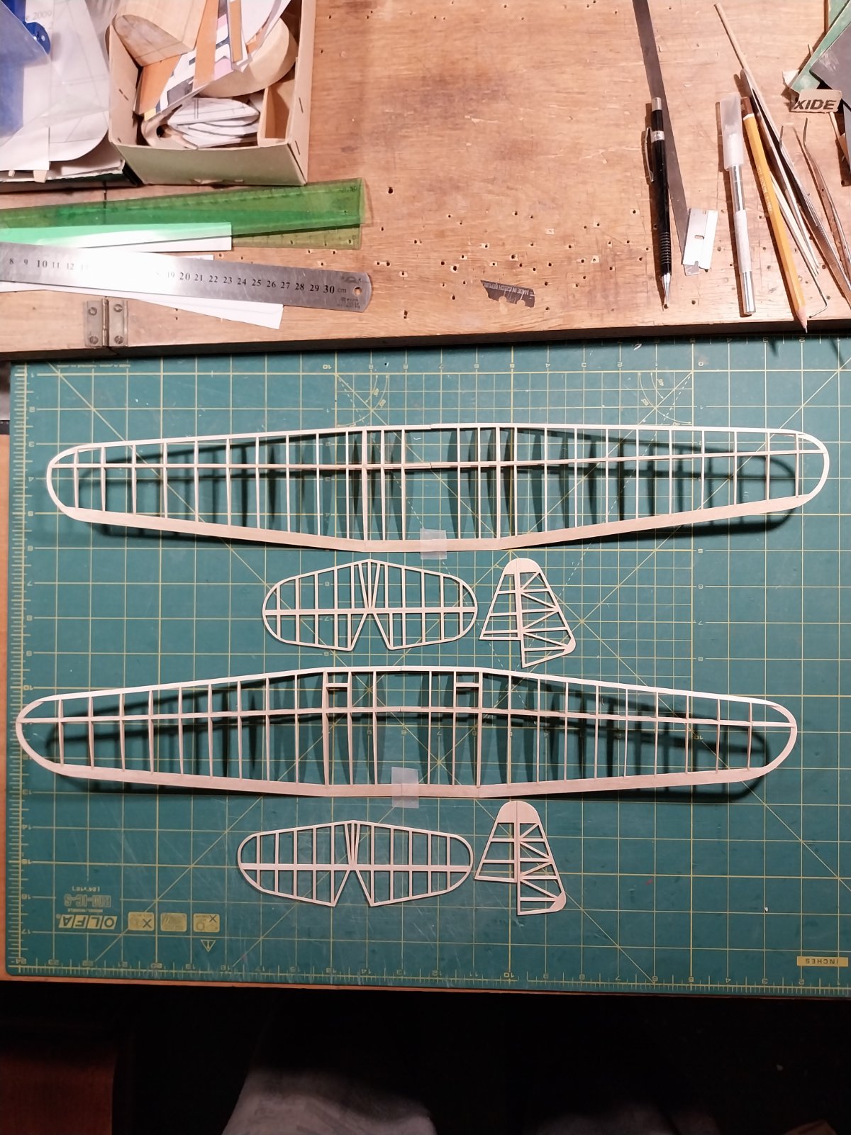 Trochu jsem upravil konstrukci křídla a ocasních ploch. A protože letadla Beta se mi líbí tak jsem rozhodl nakreslit plánek na dvacetinku Beta 252 Scolar. Plánek jsem kreslil podle monografie z časopisu Modelář. Když jsem pracovní plánek vytisknul neodolal jsem a začal stavět i Betu Sccolar. Zatím si stavbu obou modelů moc užívám. Křídlo a ocasní plochy v horní části fotky jsou pro Betu 252 Scolar. Další v pořadí československých letadel bude Letov Š 39.