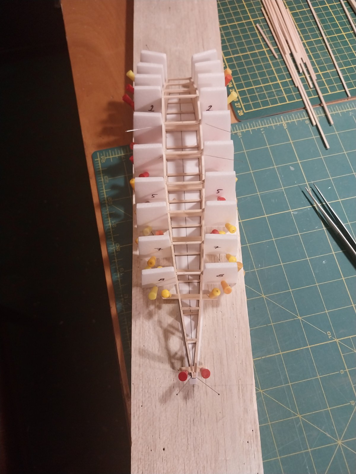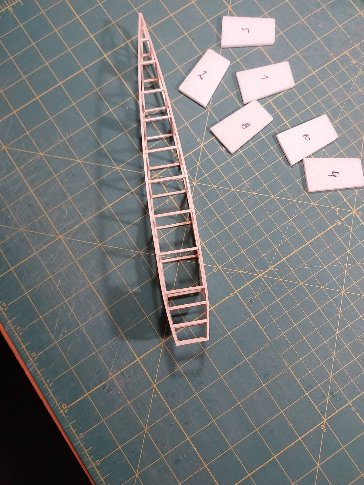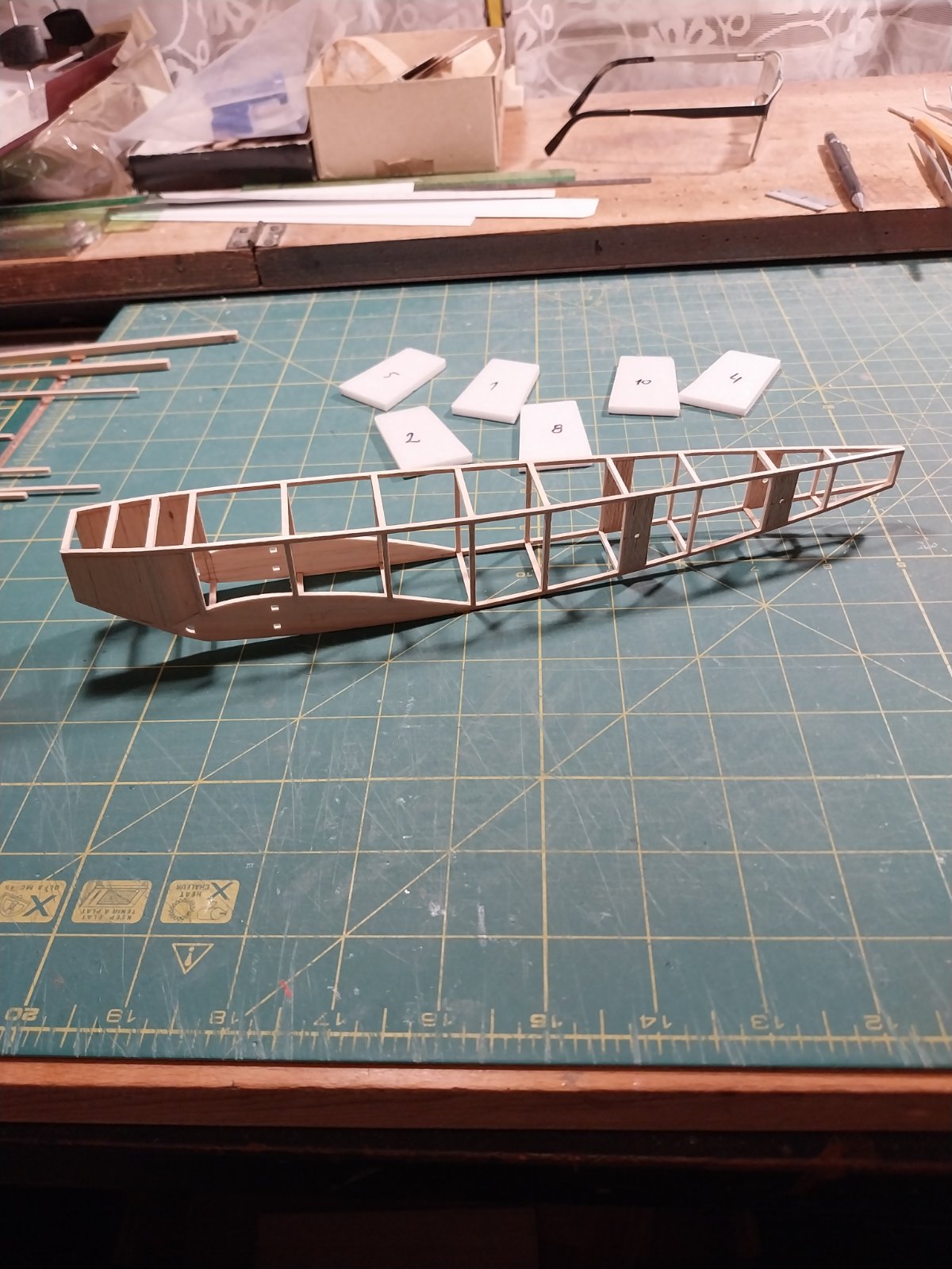 Slepená základní příhradovina trupu na Beta Scolar připravená pro lepení polopřepážek horní části trupu.