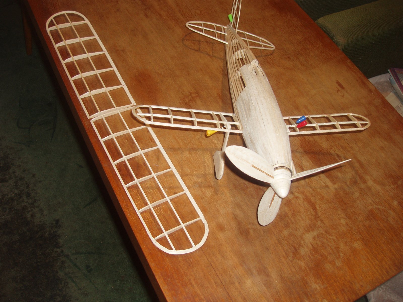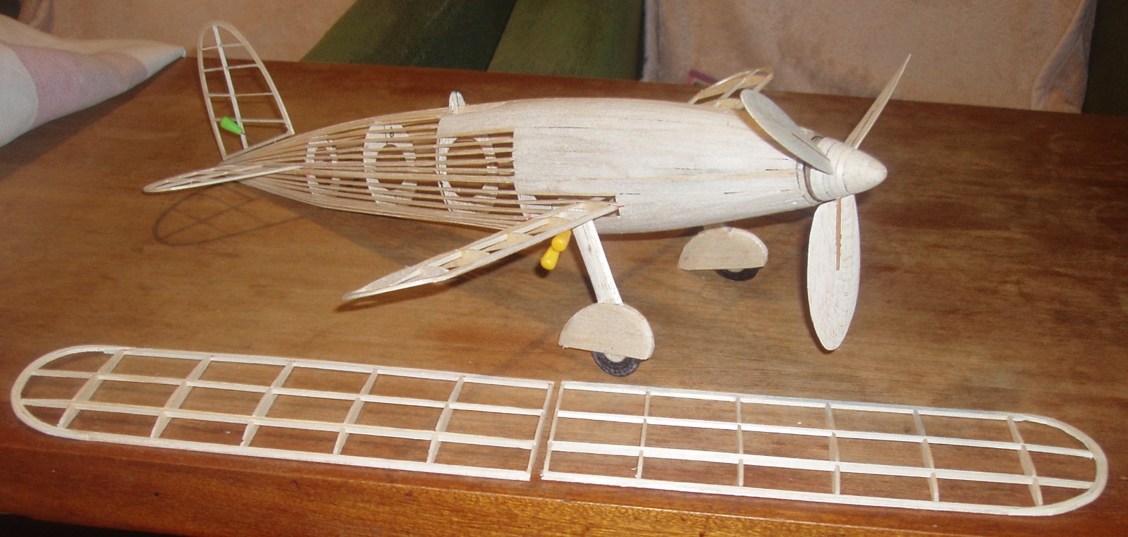 Tak v podstatě je kostra připravená k potahování, to ale je potřeba obarvit žlutý tenký modelspan na žluto hnědý s kamuflážními zelenými a hnědýni skvrnami. Po potahu spojit obě půlky horního křídla, přechody u kormidel, mezi trupem a spodním křídlem, vzpěry a celková kompletace.