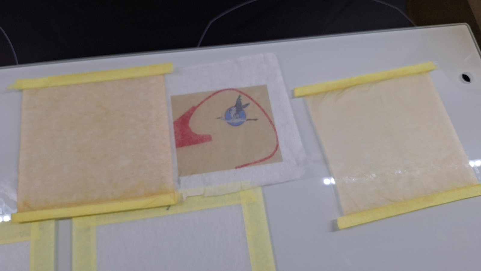 Zakladni princip tisku na papir asi zvladam, jen to chce doladit barvy. Nicmene zkusim jeste zaklad (cervenou a smetanovou) nabarvit Duhou a vytisknout na to zbytek. Prijdu tak o bilou ale ta neni tak vyrazna tak ji stejne asi budu obtahovat airbrushem. Zkousim vzorky Kashmir 9 a 6g (v Ceibe mi to popsali obracene a ja nejdriv zacal s tim 9g a divil se jak muze byt takovy balici papir tak lehky, no nebyl)
